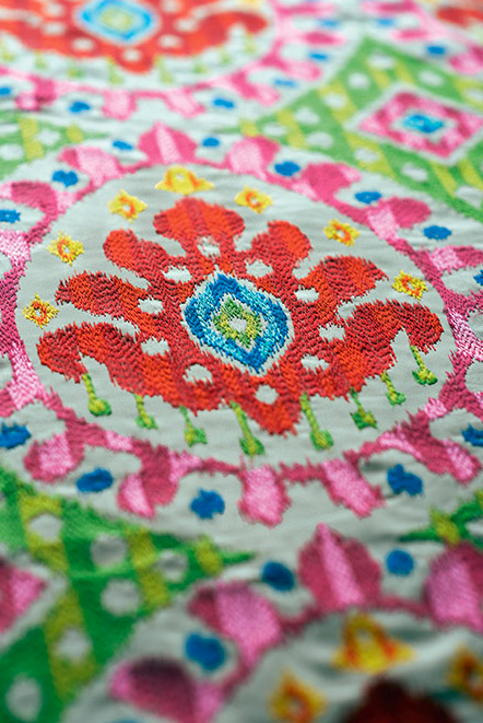 Diese bestickte Baumwolle ist der besondere Hingucker und schon ein kleines Kissen mit dieser Meterware kann Ihr ganzes Zimmer verzaubern.