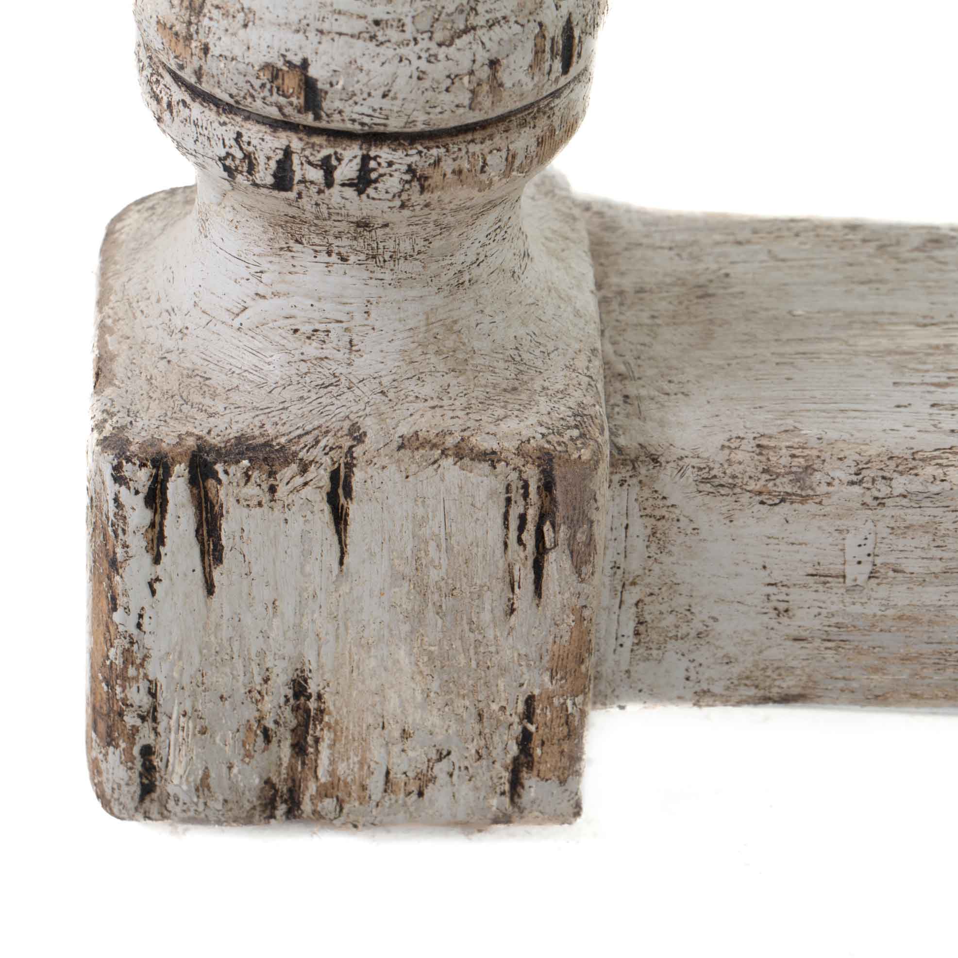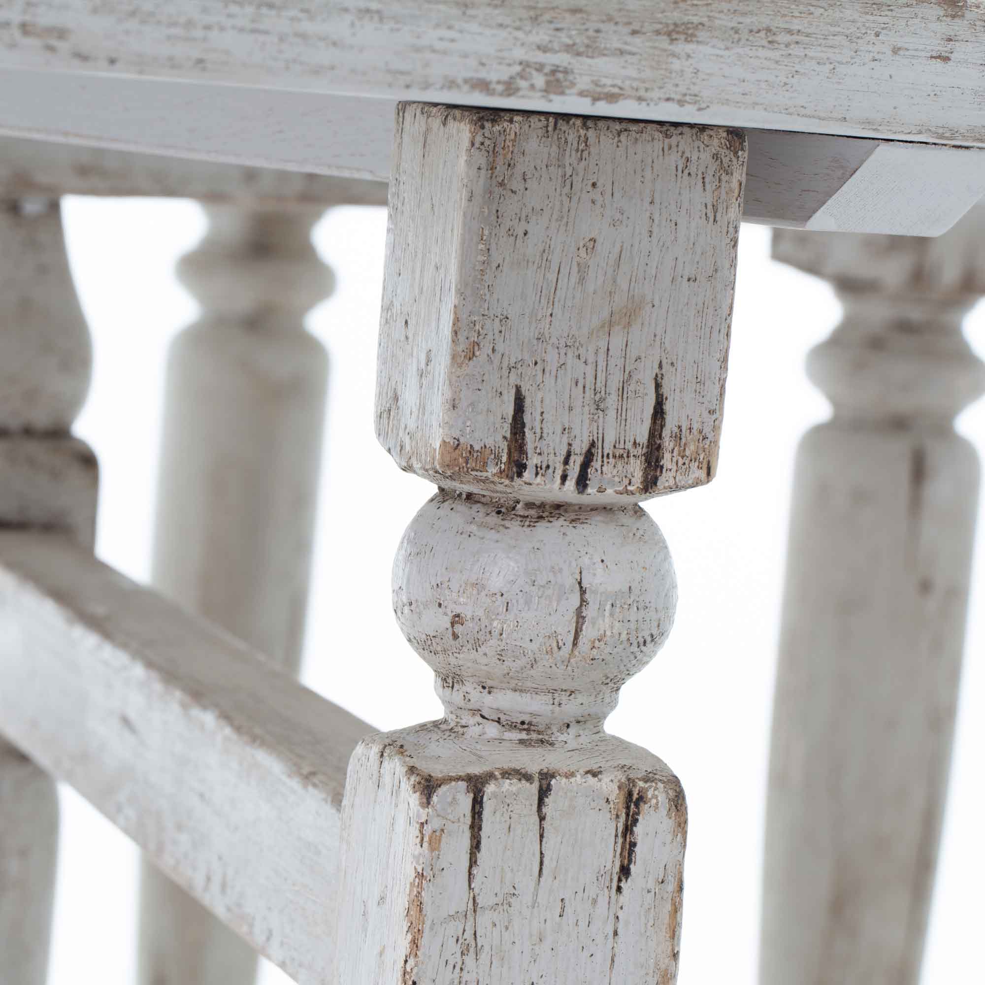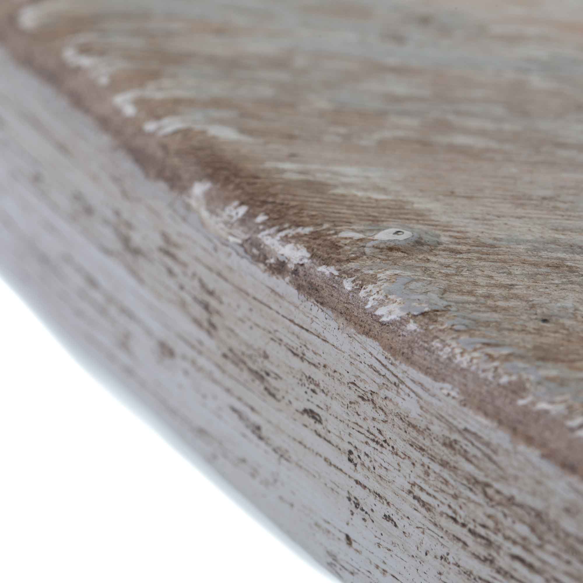 Die ovale Form wirkt weich und einladend, der Charakter des alten Pinienholzes sorgt für Wärme und Authentizität. Das weißgekalkte Finish verleiht dem Tisch eine ruhige, leicht antike Patina – ideal für Landhaus-, Provence-, Natural-Living- oder charmant reduzierte Interieurs.