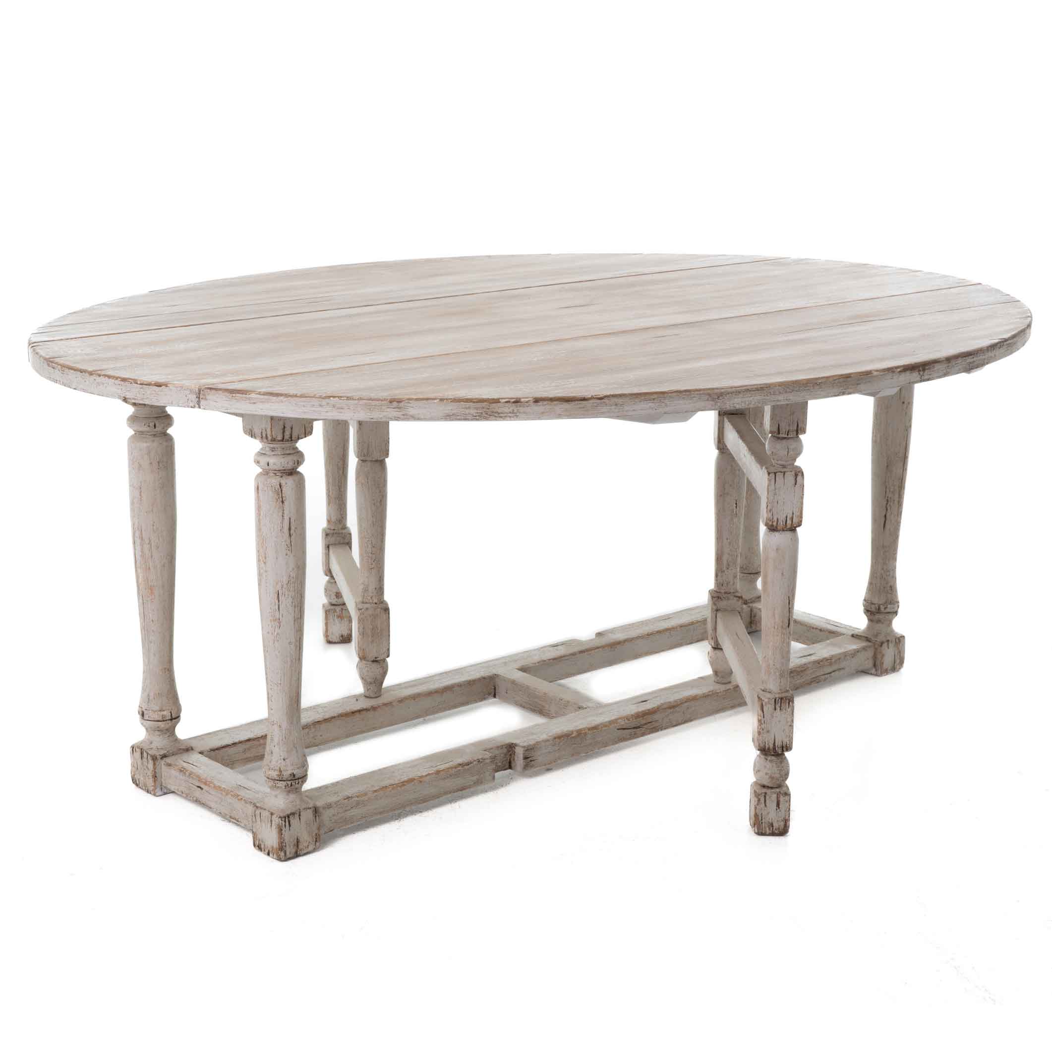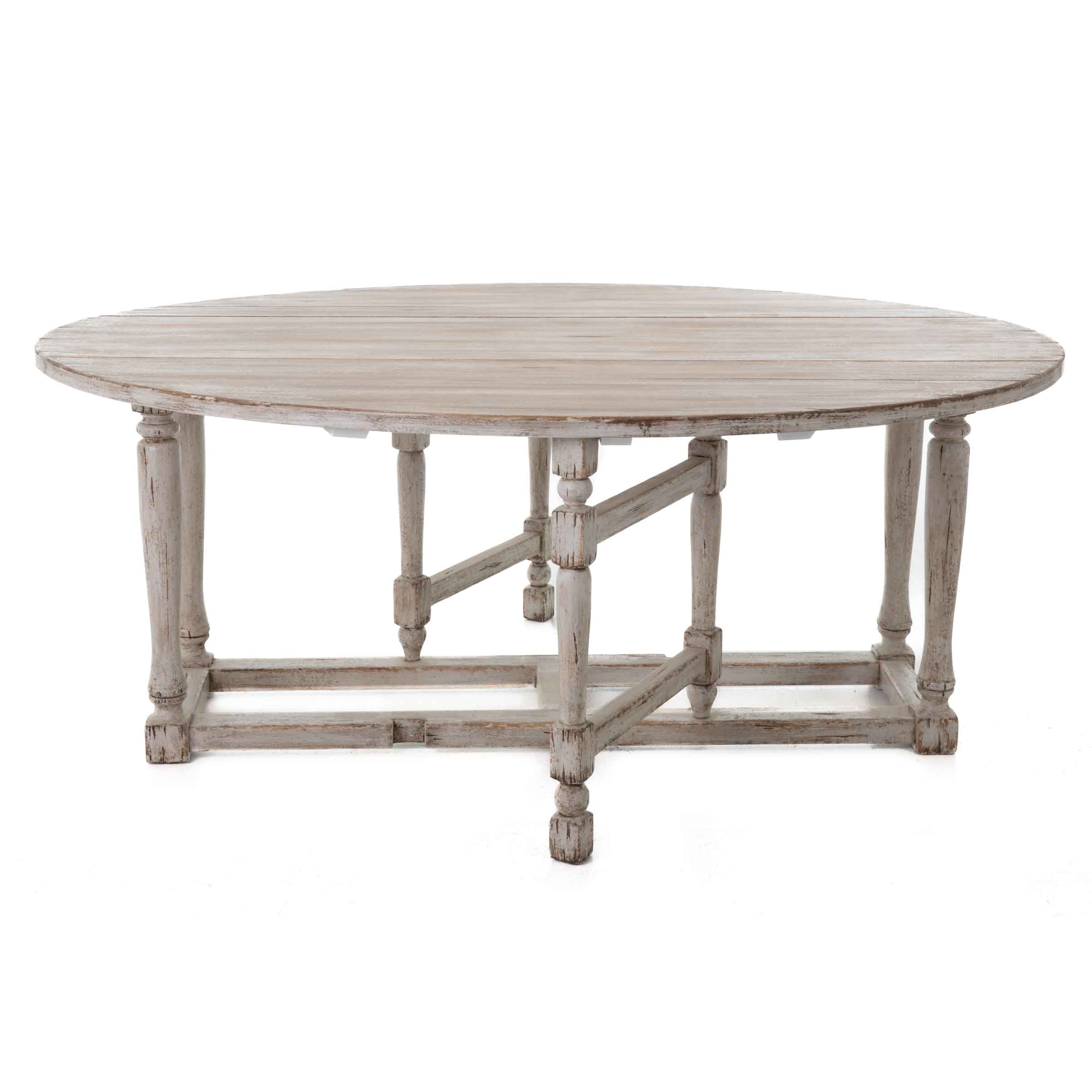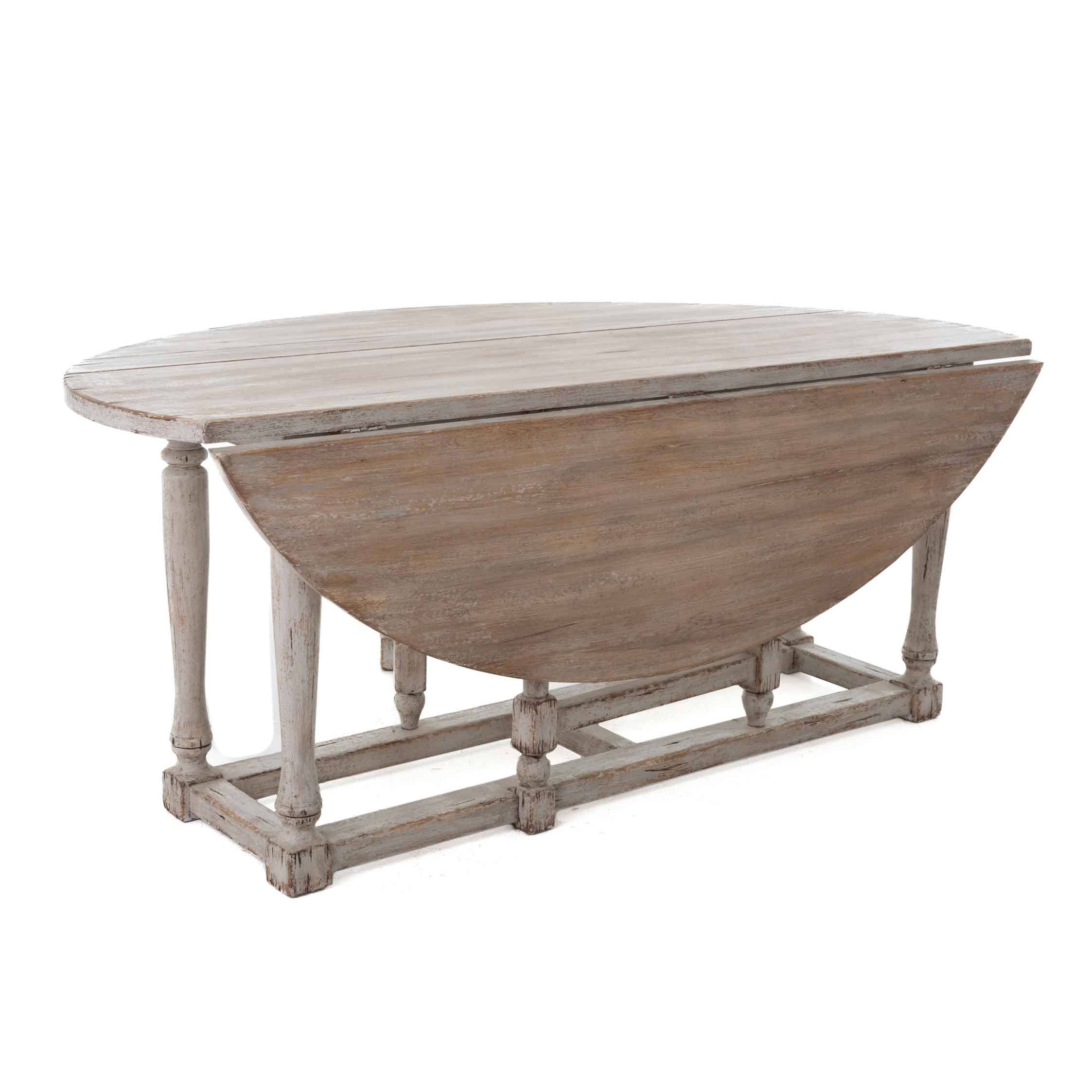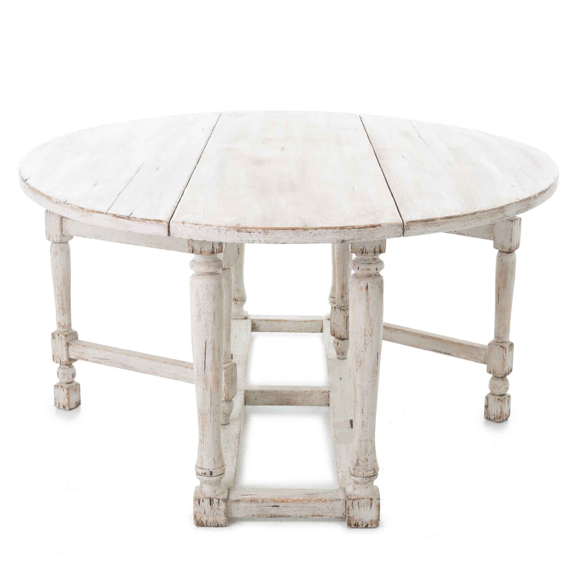 Der Gateleg-Tisch Harrison von Flamant ist eine echte Rarität: ein klassischer, ovaler Klapptisch (Gateleg), der heute nur noch selten in dieser Qualität zu finden ist. Gefertigt aus altem Pinienholz und veredelt mit einem weißgekalkten Finish, bringt er die ruhige Eleganz des Provence-Stils in Ihr Zuhause.
