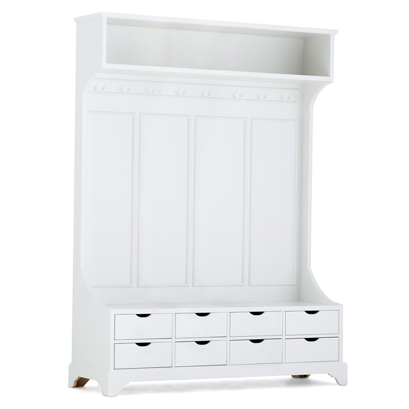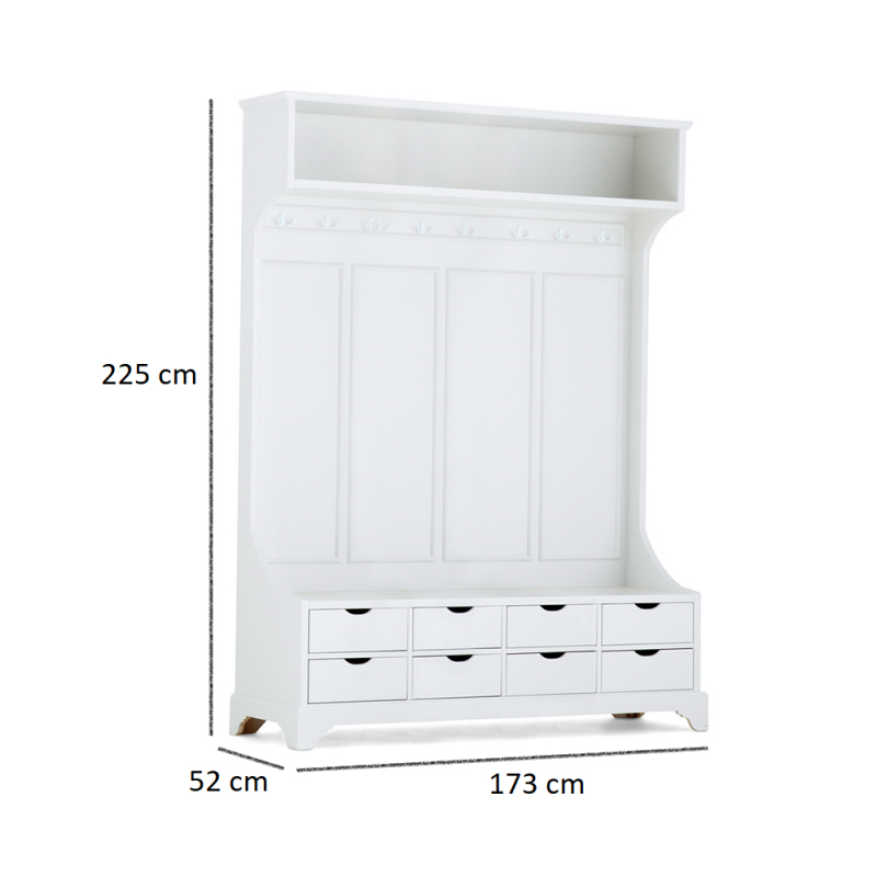Stellen Sie sich vor, Sie betreten Ihr Zuhause und werden von einer Garderobe empfangen, die nicht nur funktional ist, sondern auch ein Statement setzt. Aus massiver Pinie gefertigt und mit einem liebevoll von Hand aufgetragenen Antikweiß-Finish versehen, bringt dieses Möbelstück den Charme des Landhausstils in Ihren Eingangsbereich.