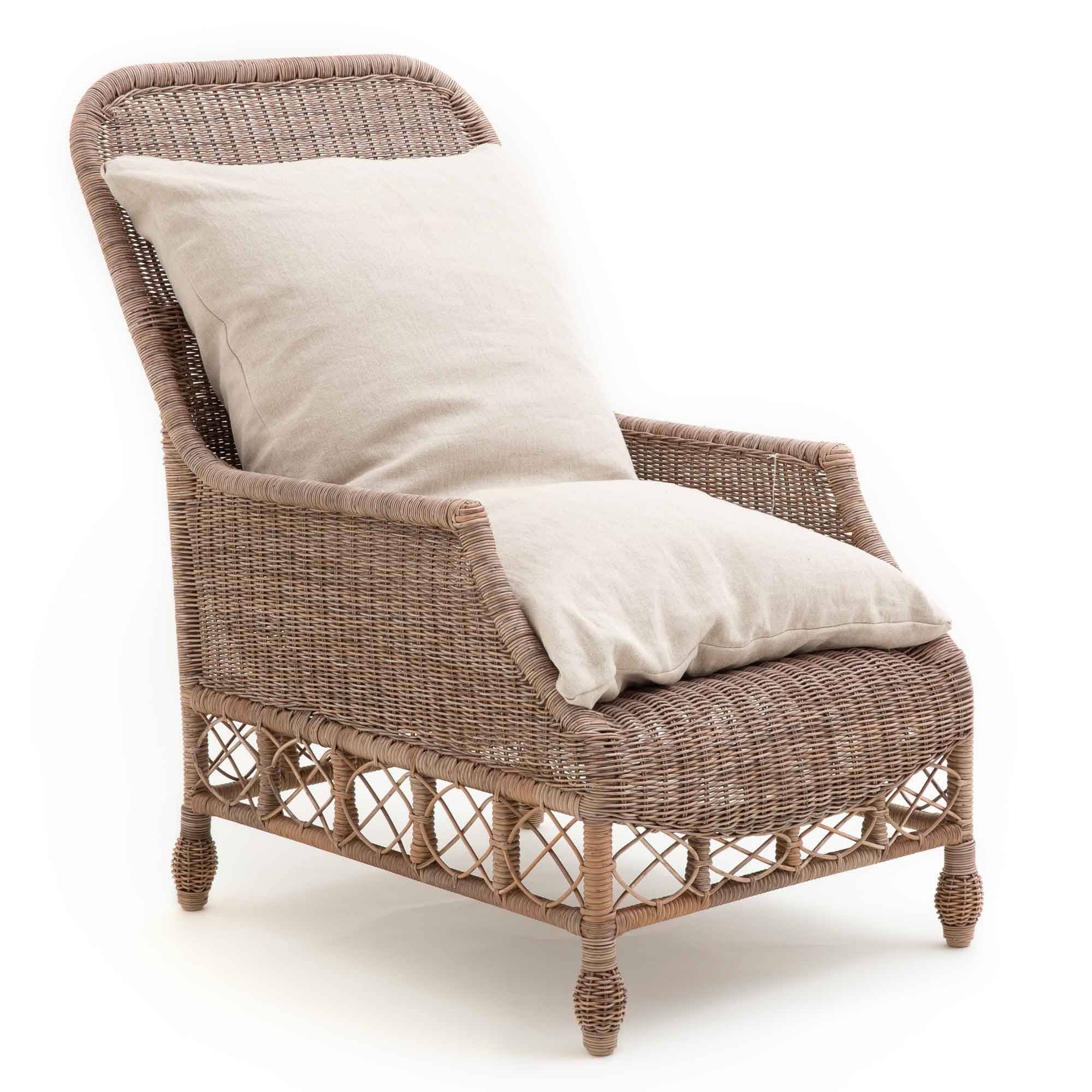 Der Sessel wird aktuell mit wetterfesten Auflagen in der Farbe offwhite oder natural geliefert. Der Outdoor-Stoff ist wasserabweisend, mit UV-Filter ausgestattet und beständig gegen Salzwasser sowie Chlorwasser – ideal für Pool- und Küstenbereiche.