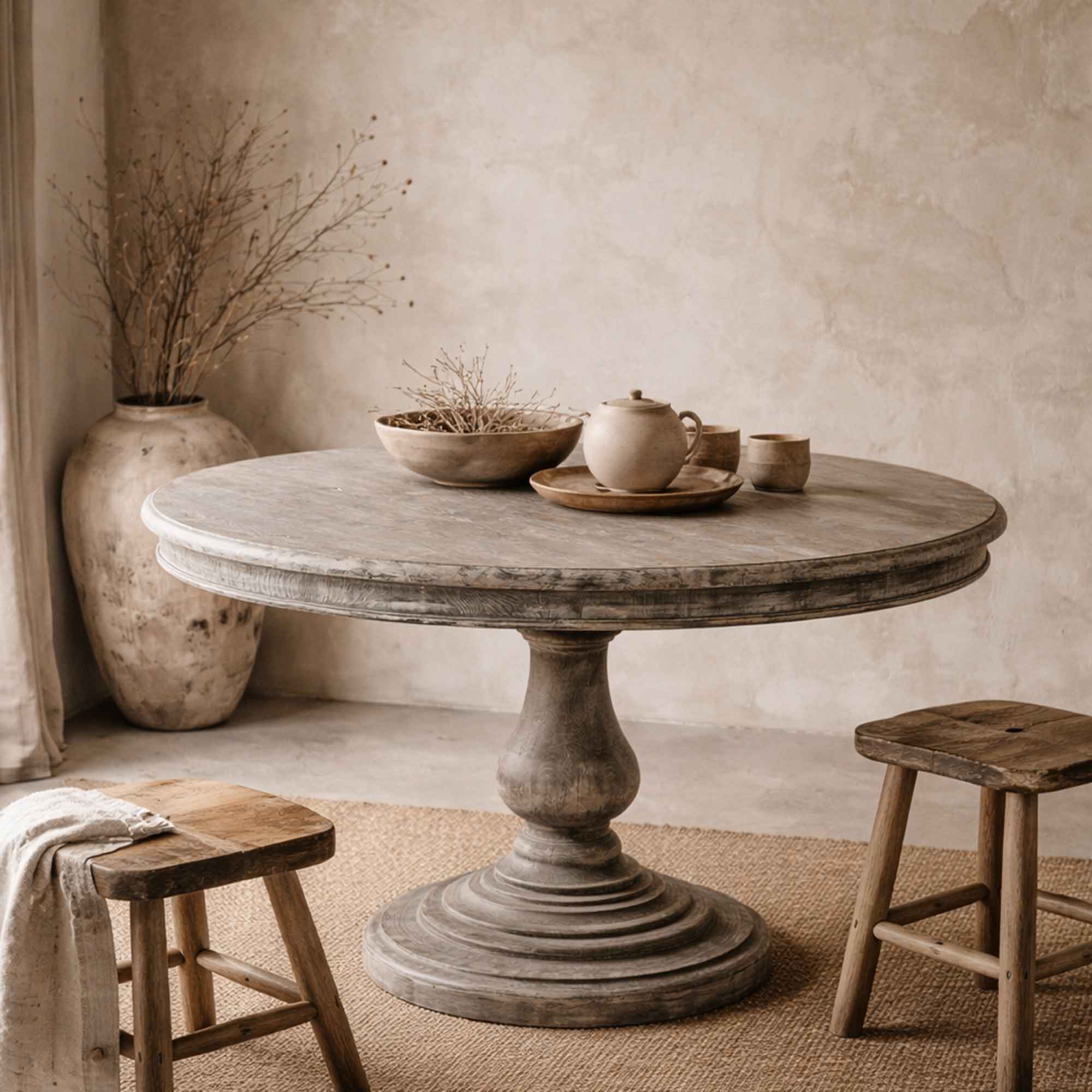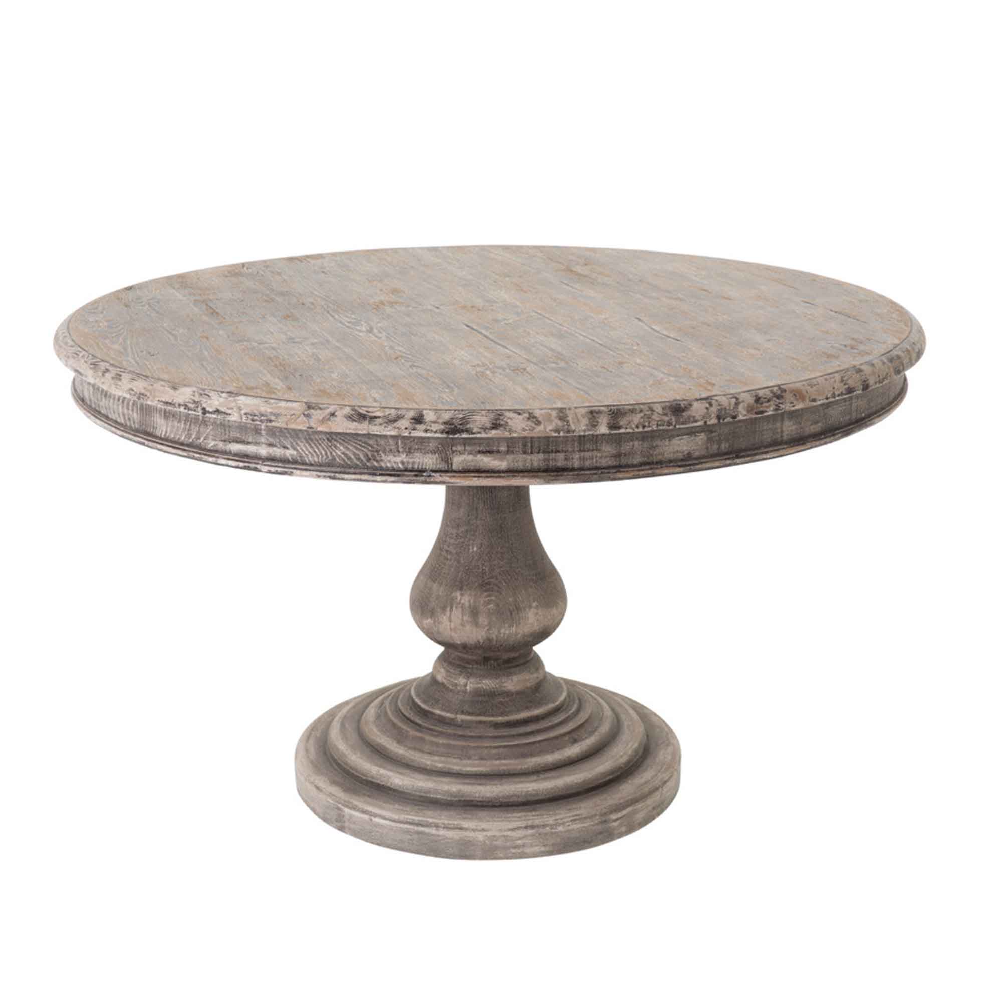 Der runde Tisch Stanza von Flamant ist ein ausdrucksstarker Esstisch aus massivem Pinienholz
