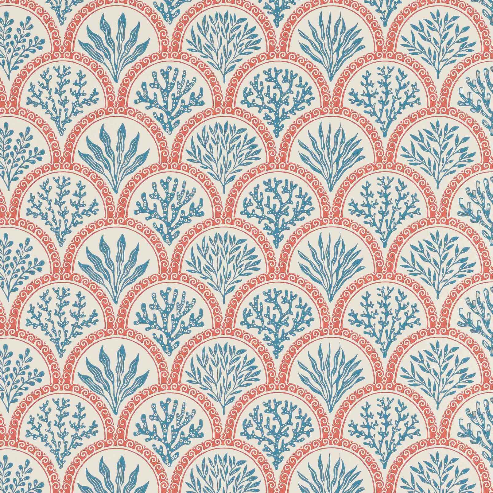 Die Oberfläche wurde so bedruckt, dass sie den Eindruck eines Blockdrucks erweckt. Auf diesem fröhlichen, unverwechselbaren Papier sind Korallenmotive in einem dekorativen Muscheldesign gedruckt. Es ist in leuchtenden, spritzigen Farbtönen gehalten und wird durch einen bedruckten Stoff gleichen Namens ergänzt.