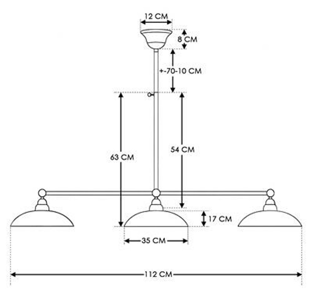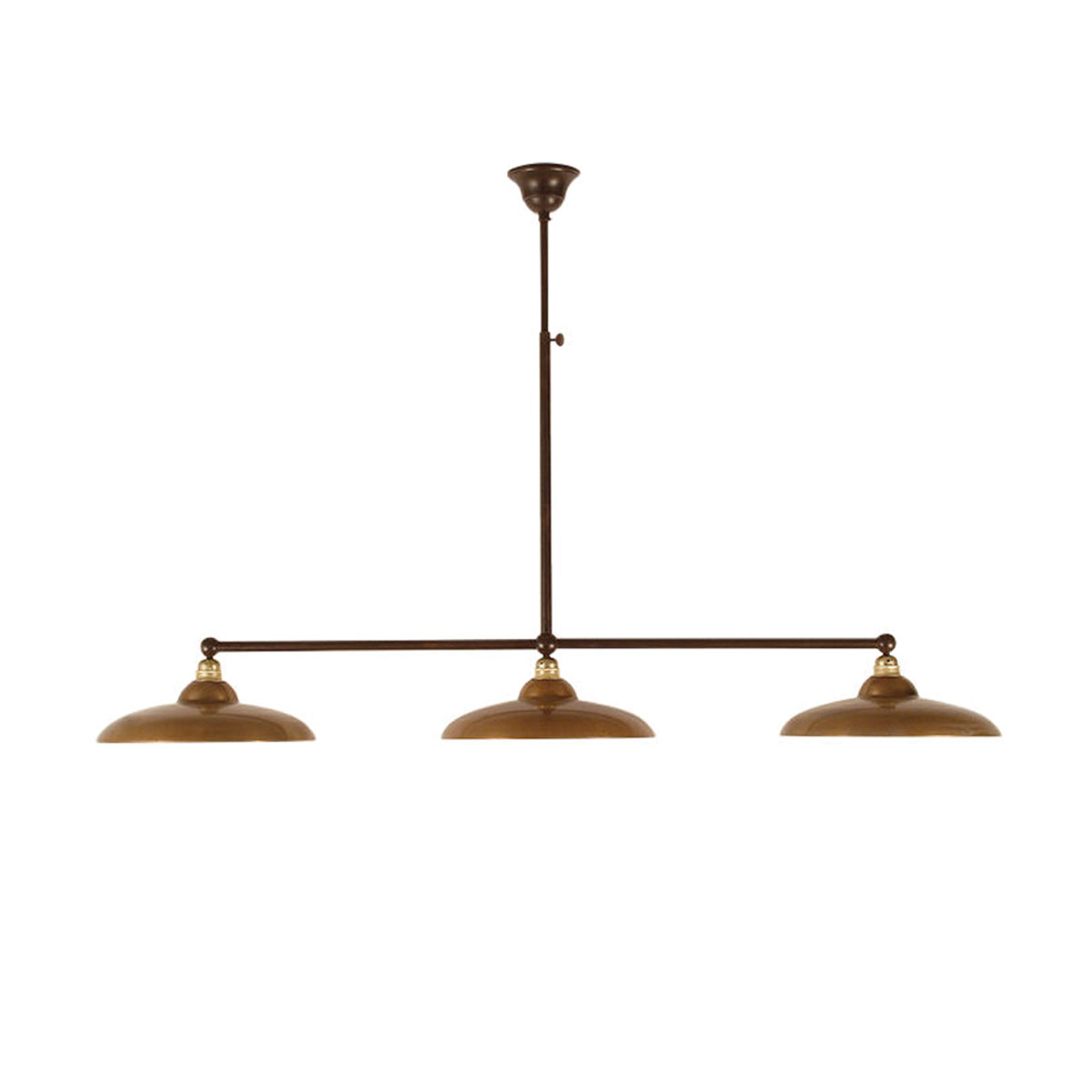 Zeitlose Deckenleuchte mit schöner eleganter Aufhängung und drei runden Metallschirmen in brunierten Messing