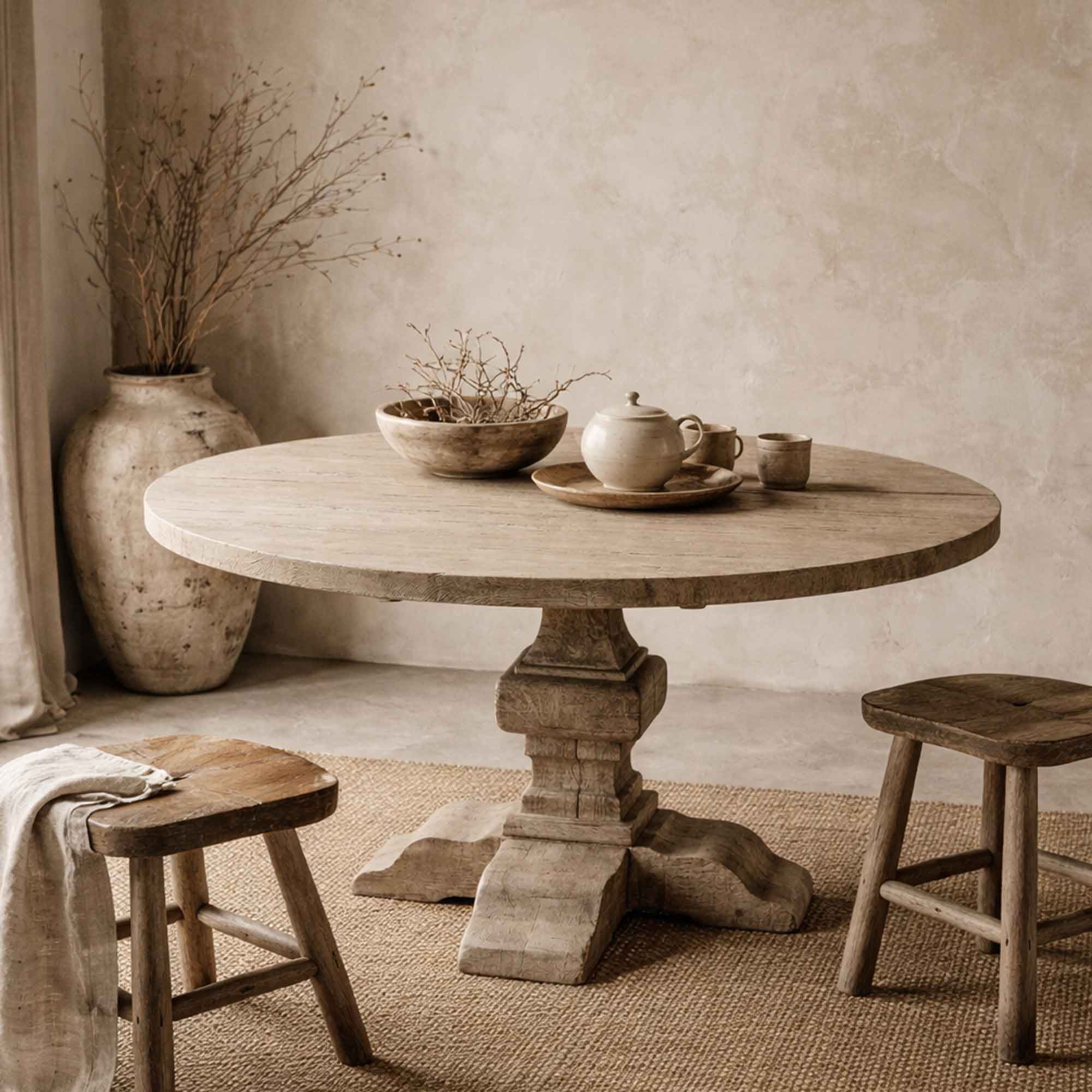 Alain verbindet klassische Ruhe mit moderner Klarheit. Die runde Tischplatte wirkt einladend und harmonisch,