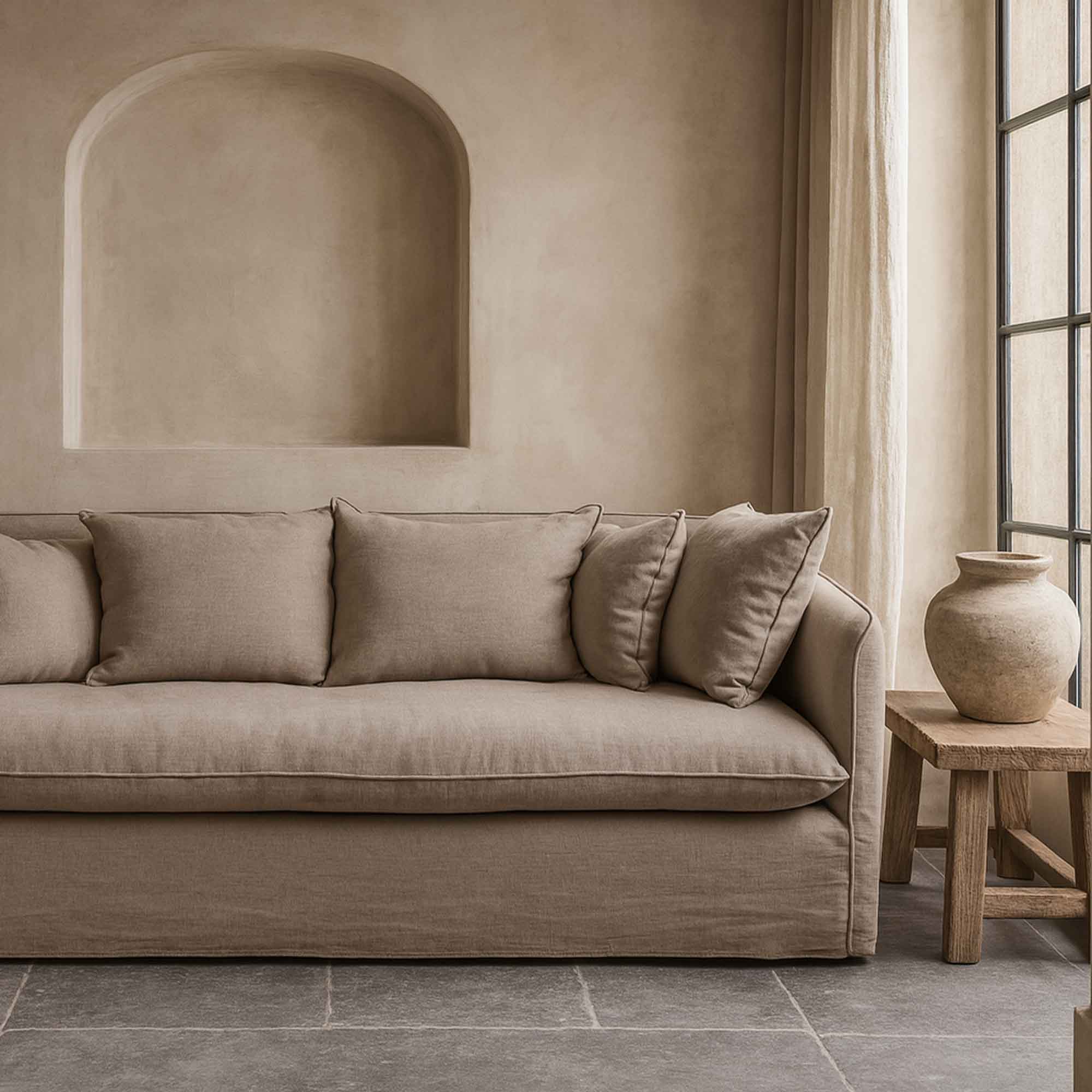 Die Husse aus naturfarbenen Leinen ist abnehmbar und waschbar.