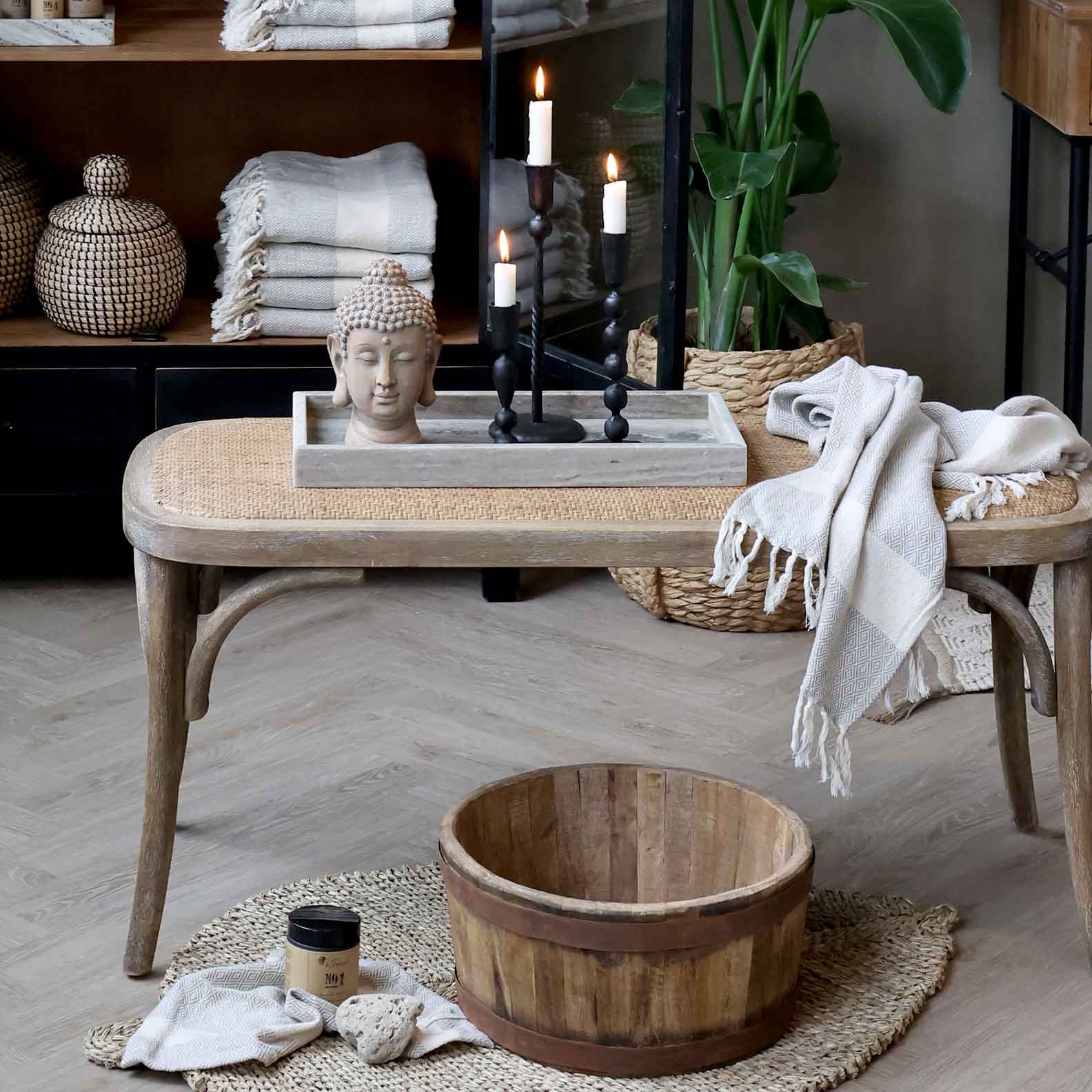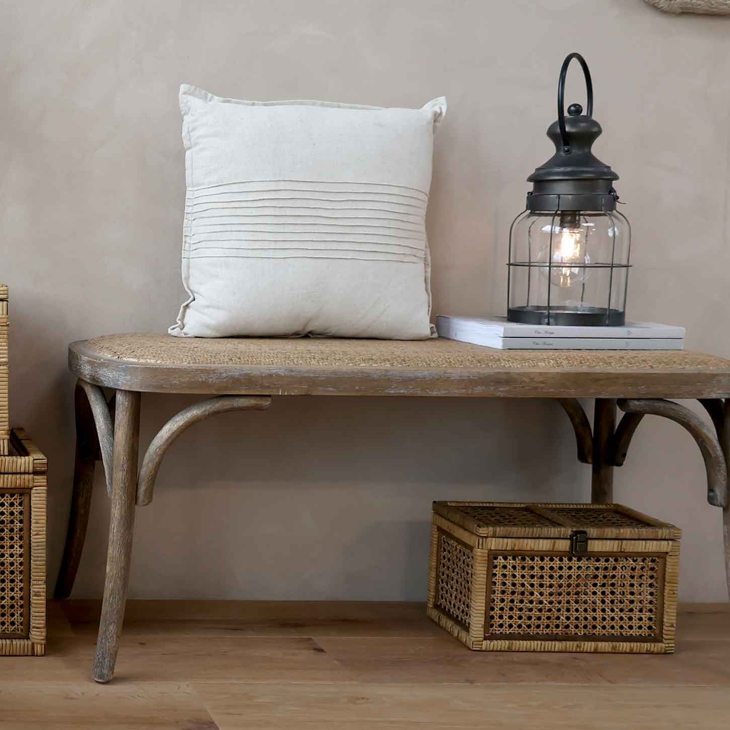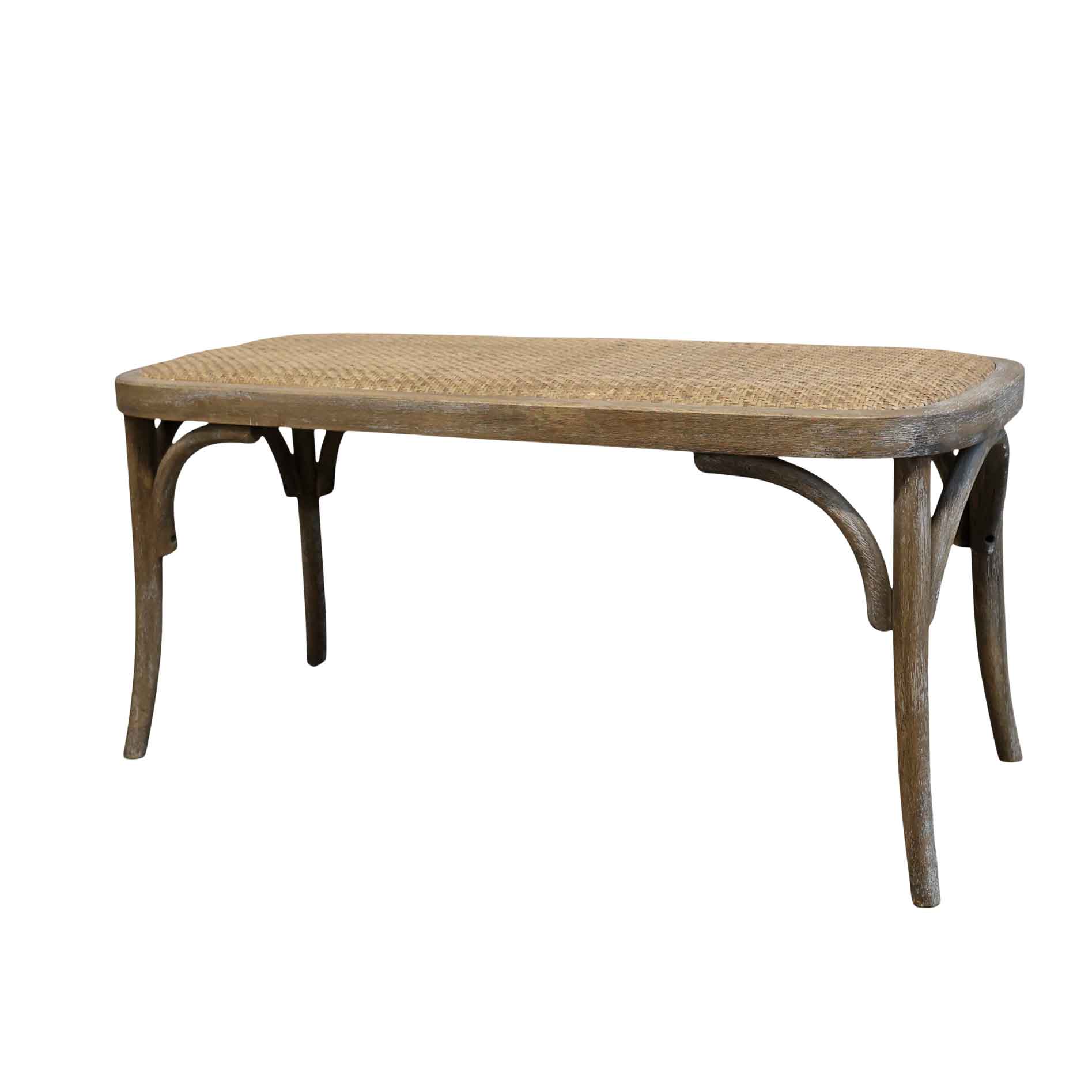 Wunderschöne Bank im klassischen Design mit Anklängen an den französischen Landhausstil. Einfache, aber bemerkenswerte Details zeigen ein zeitloses Design, das in vielen Einrichtungsstilen großartig aussehen wird. Der Sitz ist leicht gepolstert und mit schönem Rattan bezogen. Die Bankl wird von handgefertigtem, robustem Holz mit einer eleganten weißen Holzbeize hergestellt, die in Kombination mit dem Rattansitz großartig aussieht.