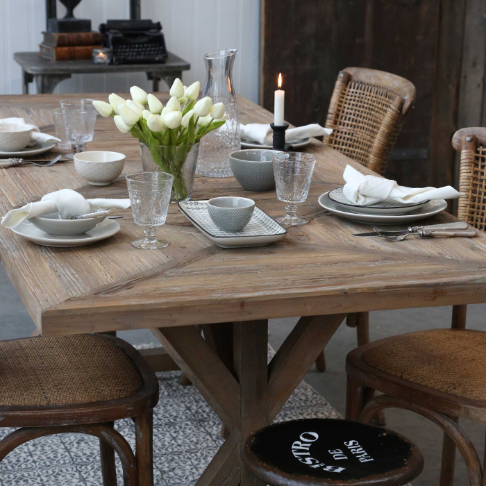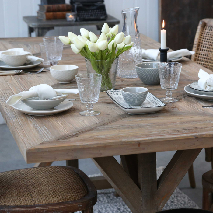 Ein charakterstarker Esstisch aus recyceltem Holz: handgefertigt, mit naturbelassener, rustikaler Platte und eleganten Querbeinen. Jedes Stück ist ein Unikat mit feinen Unebenheiten, die Geschichte und Wärme in den Raum bringen.