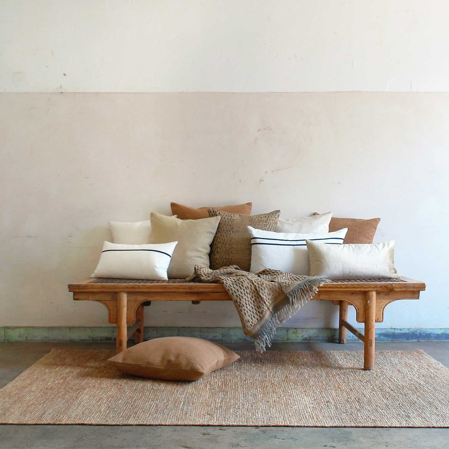 Der handgeknüpfte Teppich aus 100 % Hanf hat einen schönen warmen Farbton, der sich gut mit unseren Leinen- und Samtkissen kombinieren lässt.