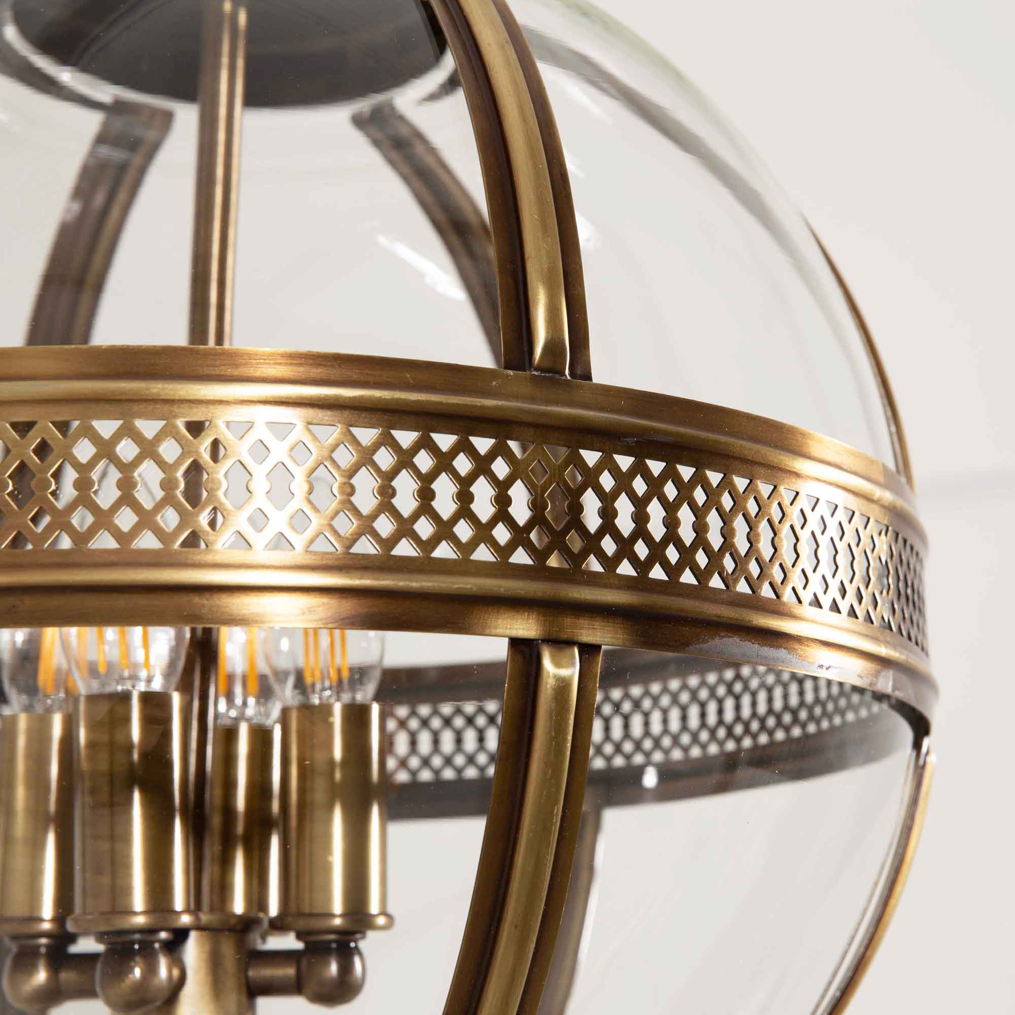 Die Hängelampe Meya mit 4 Lichtquellen vereint klassische Ästhetik mit beeindruckender Lichtwirkung. Die edle Kombination aus Glas und Messing im antiken Finish verleiht ihr eine zeitlose Präsenz, die Räume stilvoll aufwertet und ihnen eine warme, einladende Atmosphäre schenkt.