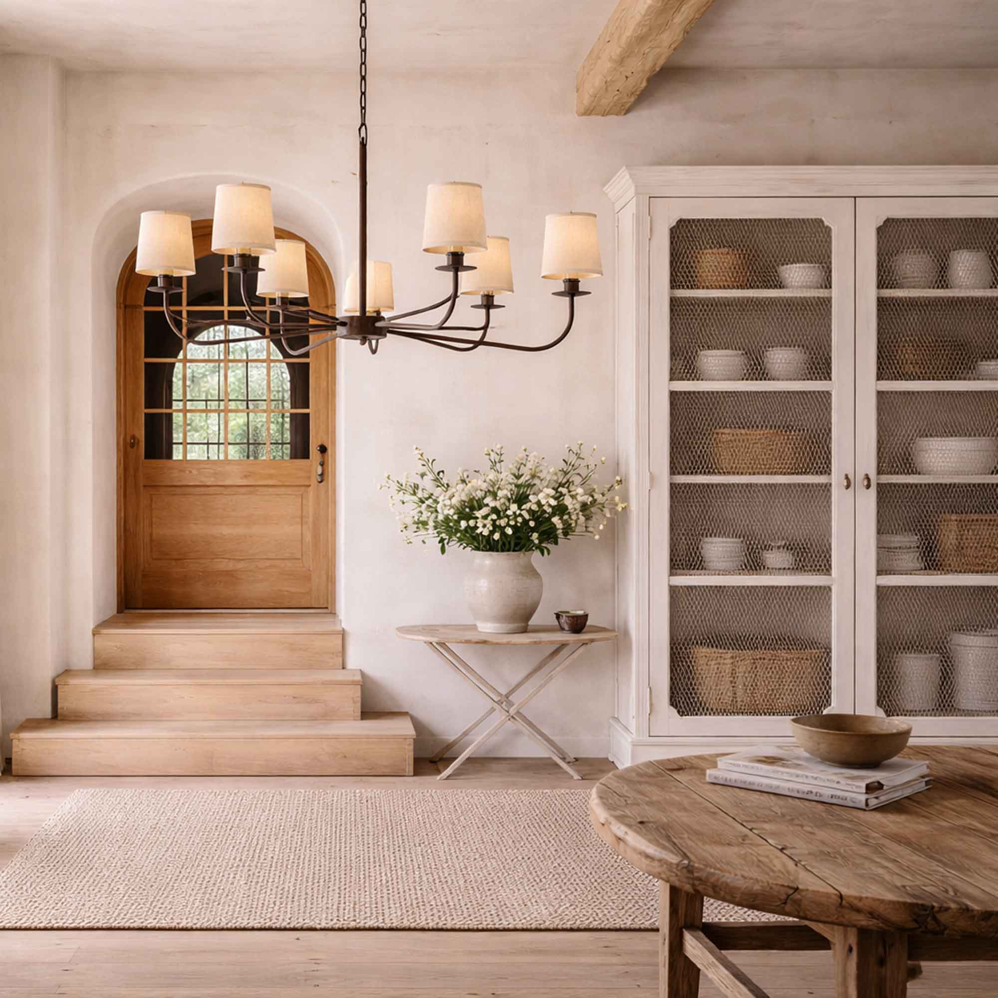 Bei Charme de Provence bieten wir den Gali in zwei Varianten: ohne Lampenschirme für einen klaren, skulpturalen Look — oder mit steckbaren Clip-Schirmchen in naturellem Leinen, die das Licht wärmer und wohnlicher machen und jederzeit gewechselt werden können.