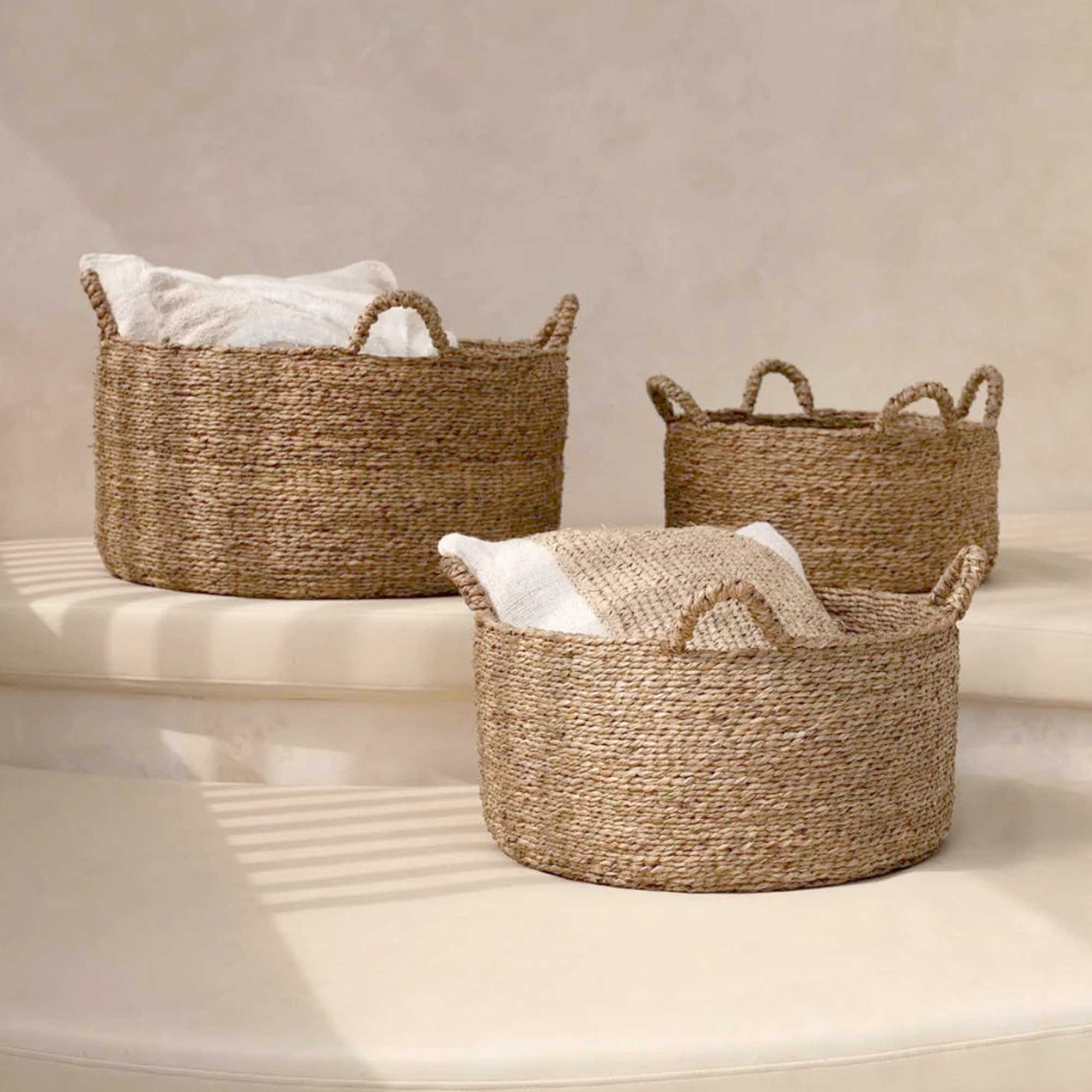Gefertigt aus geflochtenem Seegras, überzeugen die Körbe durch ihre stabile Form und ihre natürliche Ausstrahlung. Jeder Korb ist leicht, gleichzeitig robust und lässt sich flexibel im Alltag einsetzen – ob für Wäsche, Decken oder als stilvolle Aufbewahrungslösung.