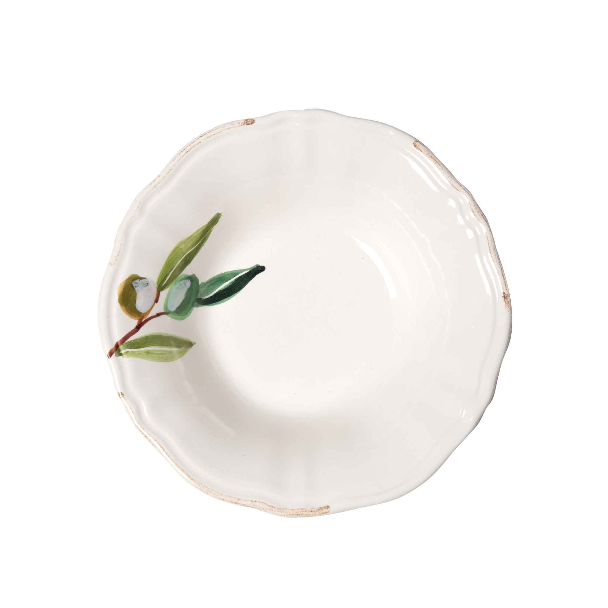 Die weich geschwungene Form und der leicht unregelmäßige Rand verleihen der Schale eine authentische, handwerkliche Wirkung. Das feine Olivenmotiv in sanften Grüntönen setzt einen stilvollen Akzent, ohne aufdringlich zu wirken, und harmoniert besonders schön mit Leinen, Holz und natürlichen Materialien – perfekt für Provence-inspirierte Arrangements ebenso wie für moderne, ruhige Tischkonzepte.