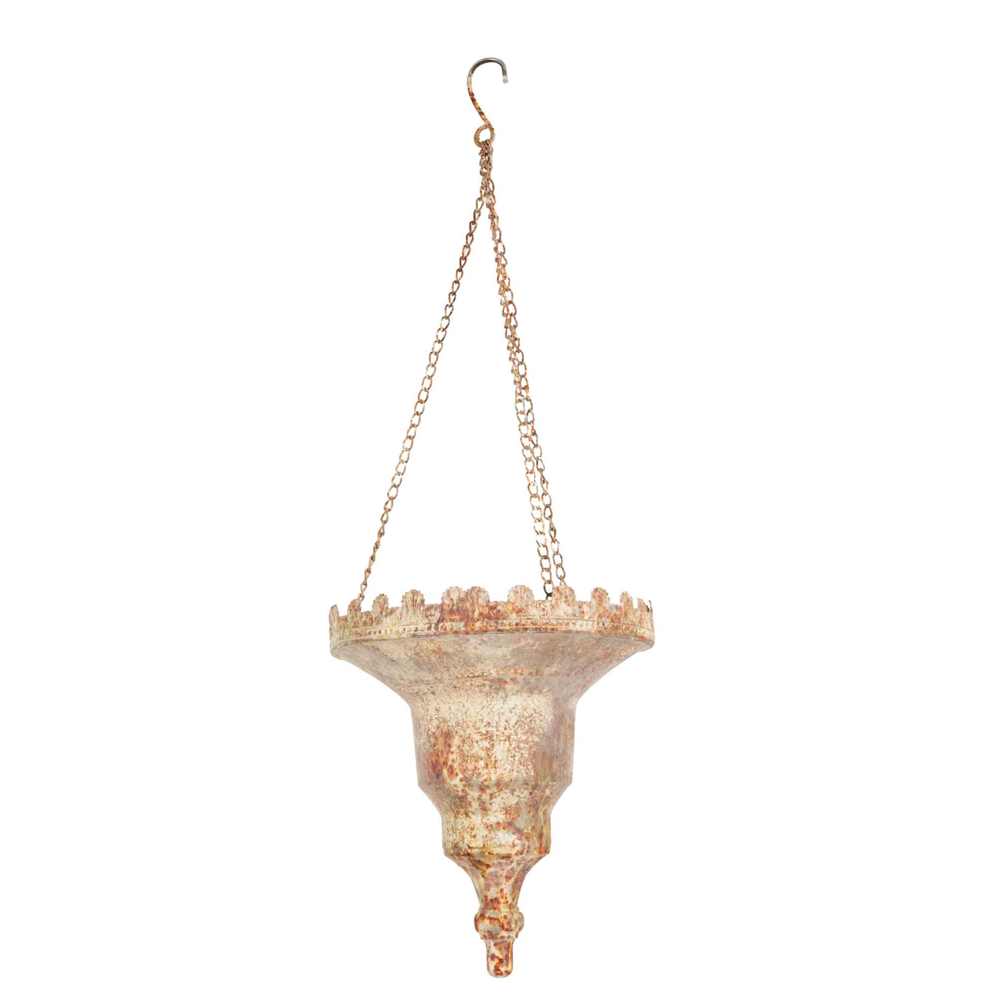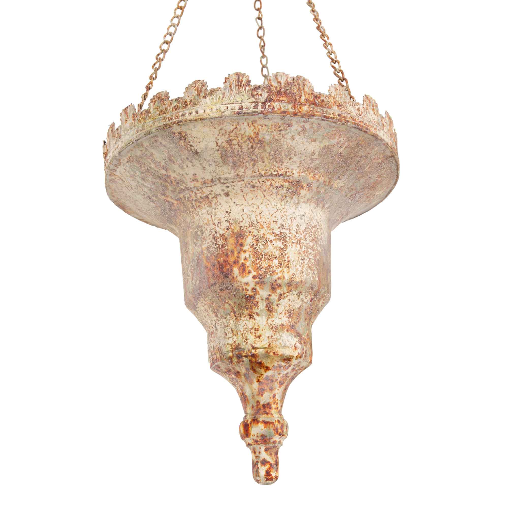 Mit seiner schlanken, nach unten zulaufenden Silhouette und der dekorativen Kettenaufhängung eignet sich dieser Pflanztopf ideal für Terrassen, Balkone, Veranden oder geschützte Eingangsbereiche. Die bewusst unregelmäßige Oberfläche und die antike Patina verleihen jedem Exemplar eine authentische, lebendige Ausstrahlung.