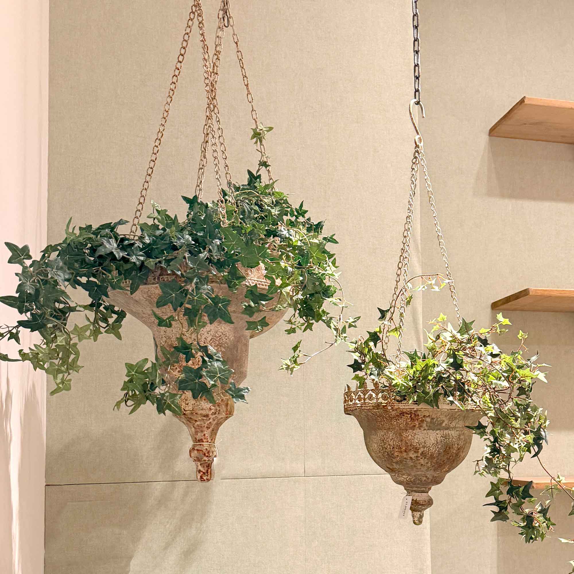Saleeba wirkt wie ein historisches Fundstück aus einem provenzalischen Garten. Die filigrane Kettenaufhängung kombiniert mit der kraftvollen Metallform schafft ein spannendes Gleichgewicht aus Leichtigkeit und Substanz. Ideal für hängende Arrangements mit Grünpflanzen, Efeu oder blühenden Pflanzen.