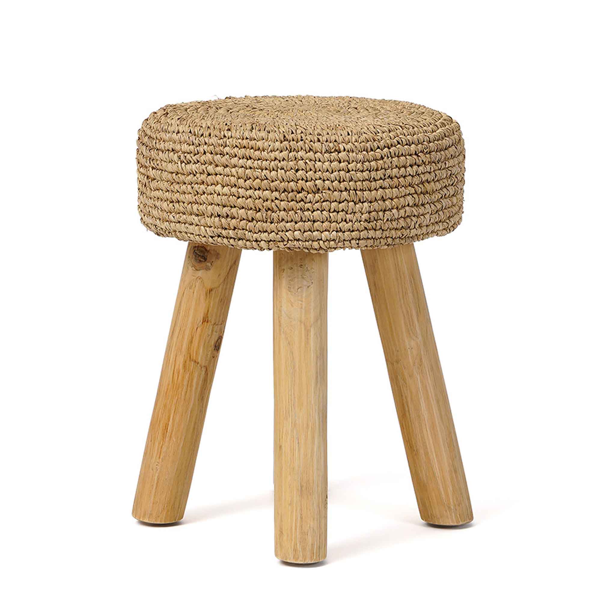 Raffia Hocker aus Teakholz — handgefertigt, 35 × 35 × 45 cm
