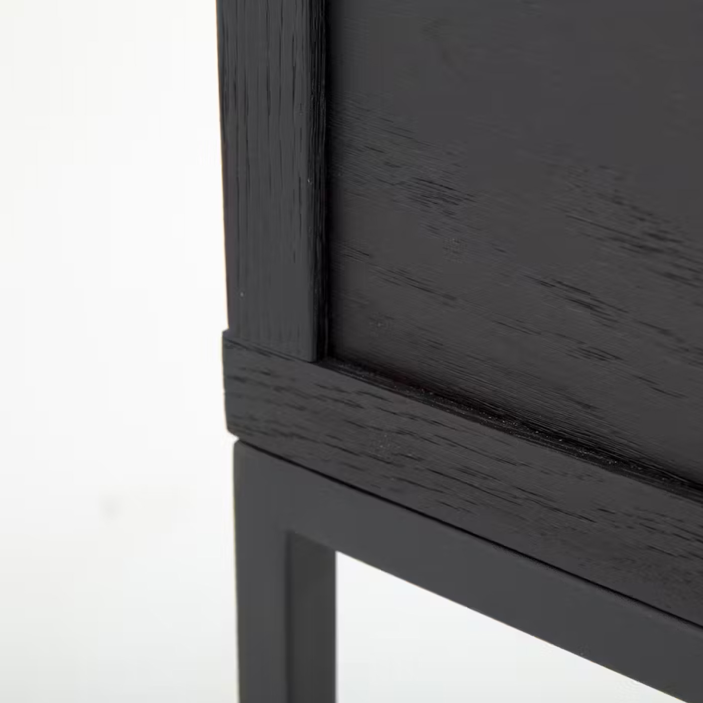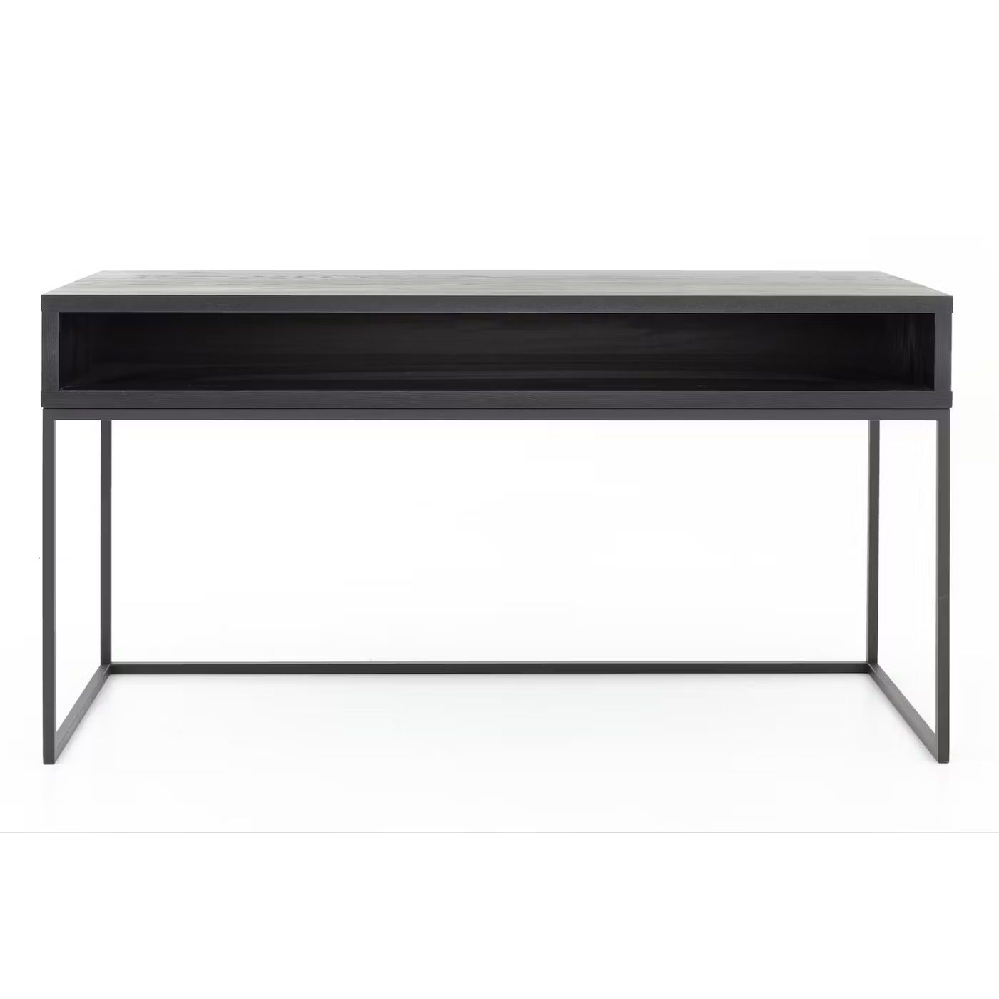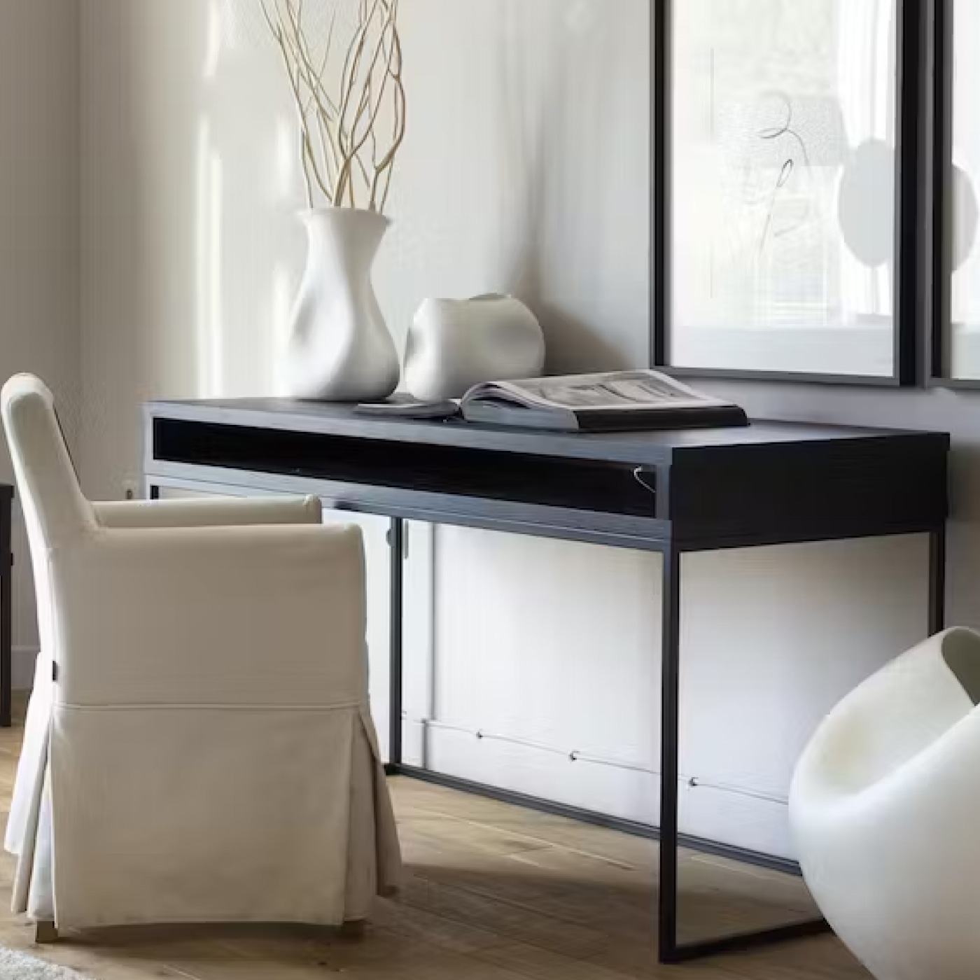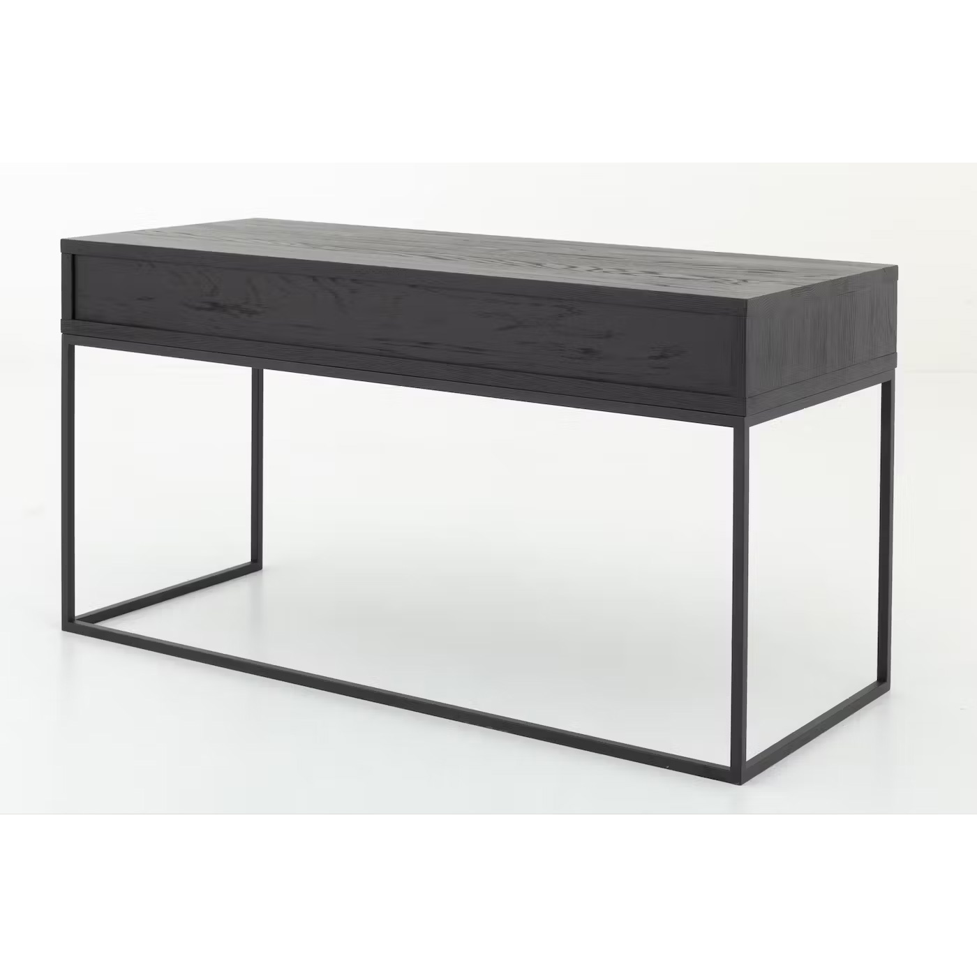 Schlichter Schreibtisch aus Eiche mit Maserung und schwarzem Finish.