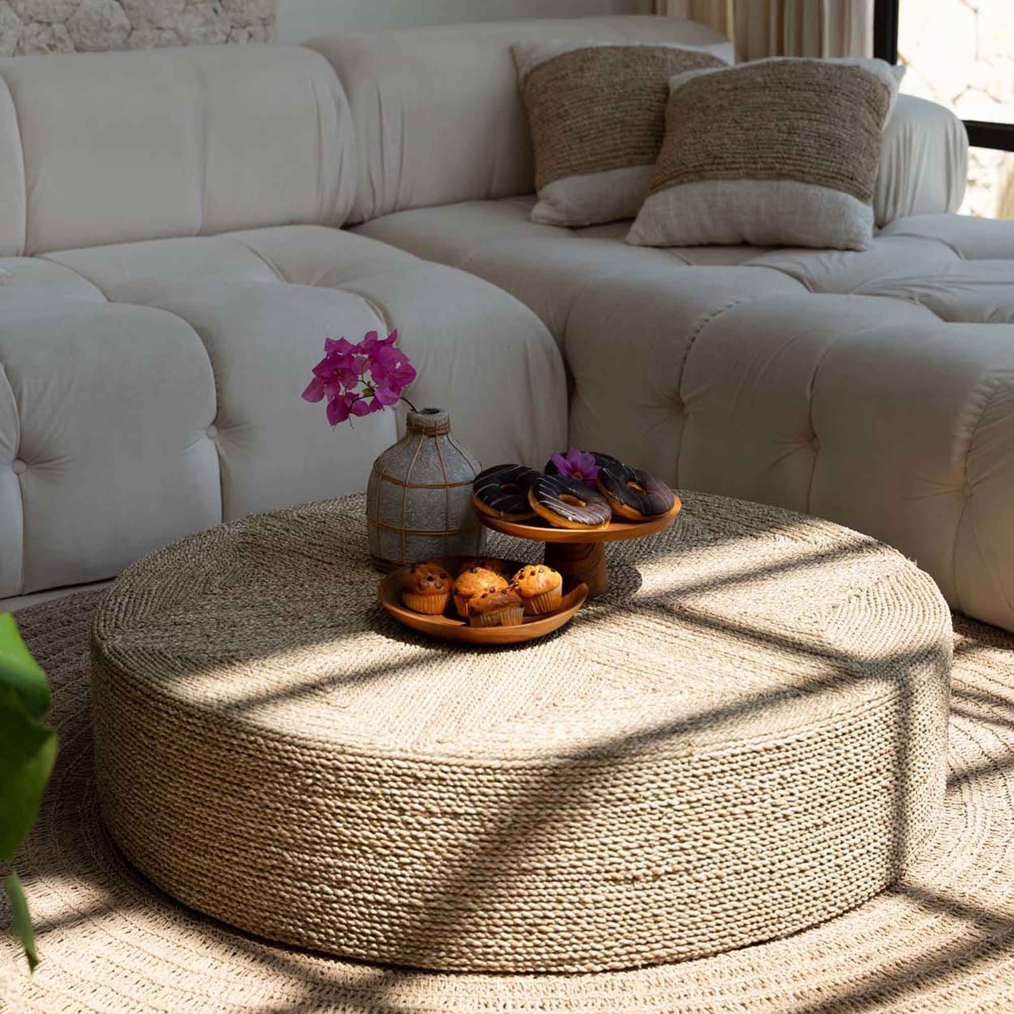 Großer Seegras Pouf — handgewebt, Ø 100 cm, als Sitz & Couchtisch