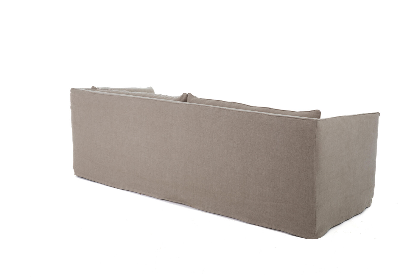Gefertigt wird Monika in Italien. Die europäische Handwerkskunst zeigt sich in jedem Detail: der fein gearbeitete Keder, der die Nähte präzise einfasst, die bewusst schlicht gehaltene Leinenhusse, die dem Sofa einen puren, natürlichen Charakter verleiht, sowie die schmalen Rückenkissen, die einen angenehmen, komfortablen Halt bieten. Die Armlehnen und die Rückenlehne laufen auf derselben Höhe zusammen – ein ästhetisches Merkmal, das Monika einen modernen, luxuriösen Look verleiht.