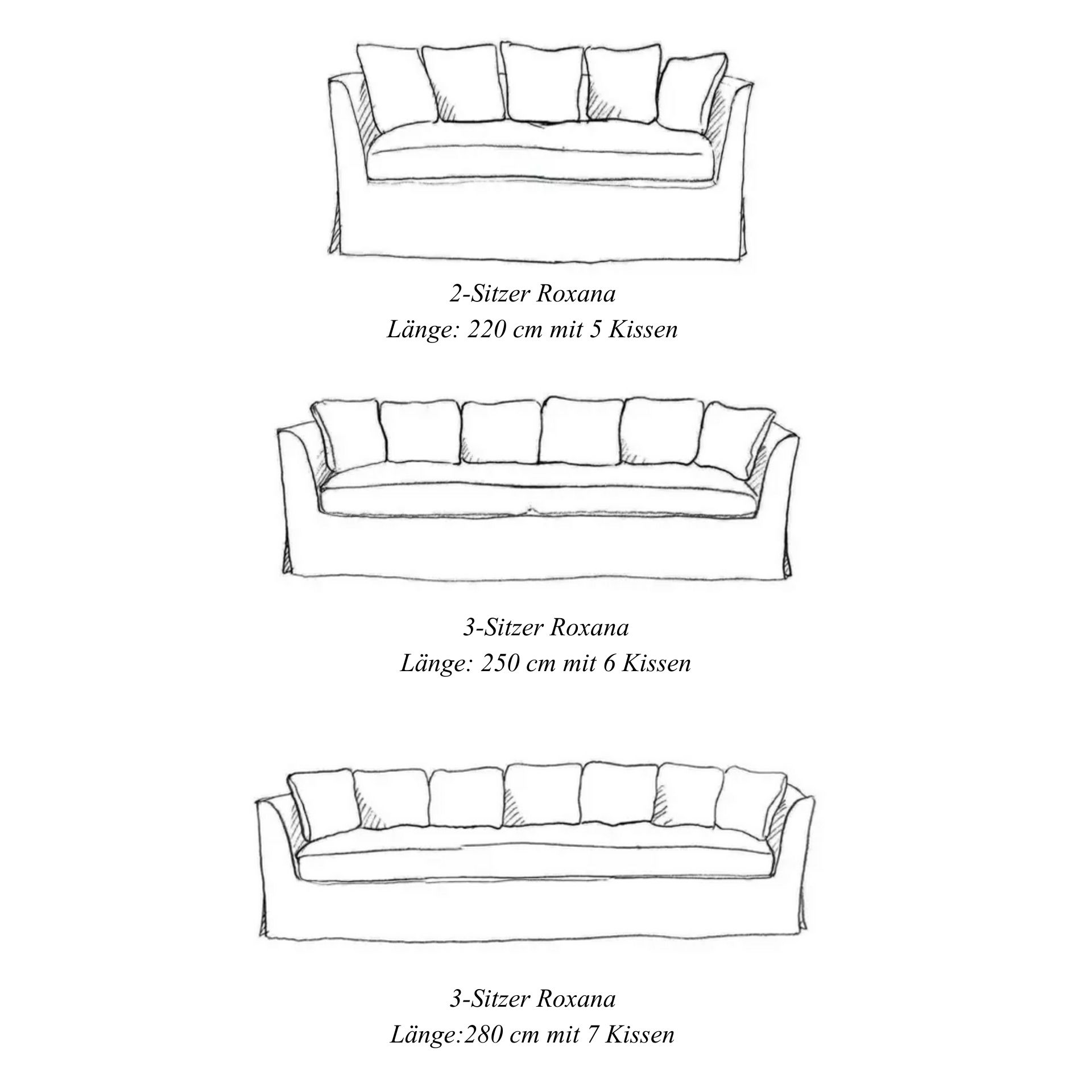 Roxana ist ein klassisches Hussen-Sofa. Die Husse ist vollständig abnehmbar und bei 30 °C waschbar. Bei festen Polsterungen sind Sitz- und Rückenkissen ebenfalls abziehbar und waschbar.