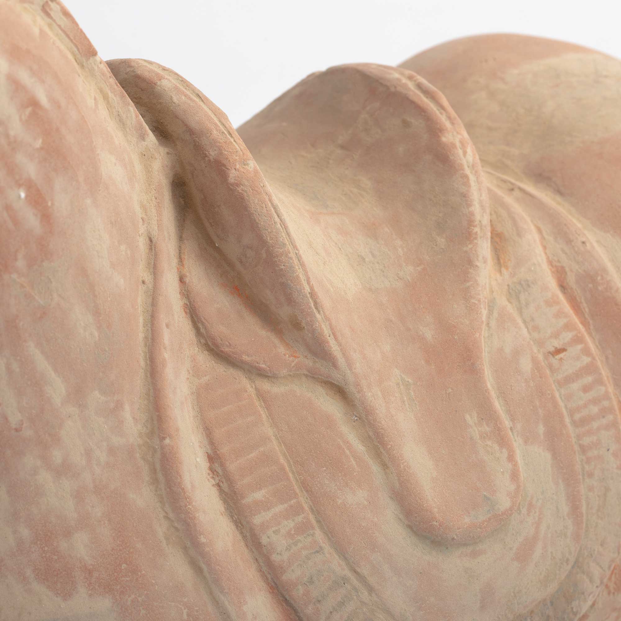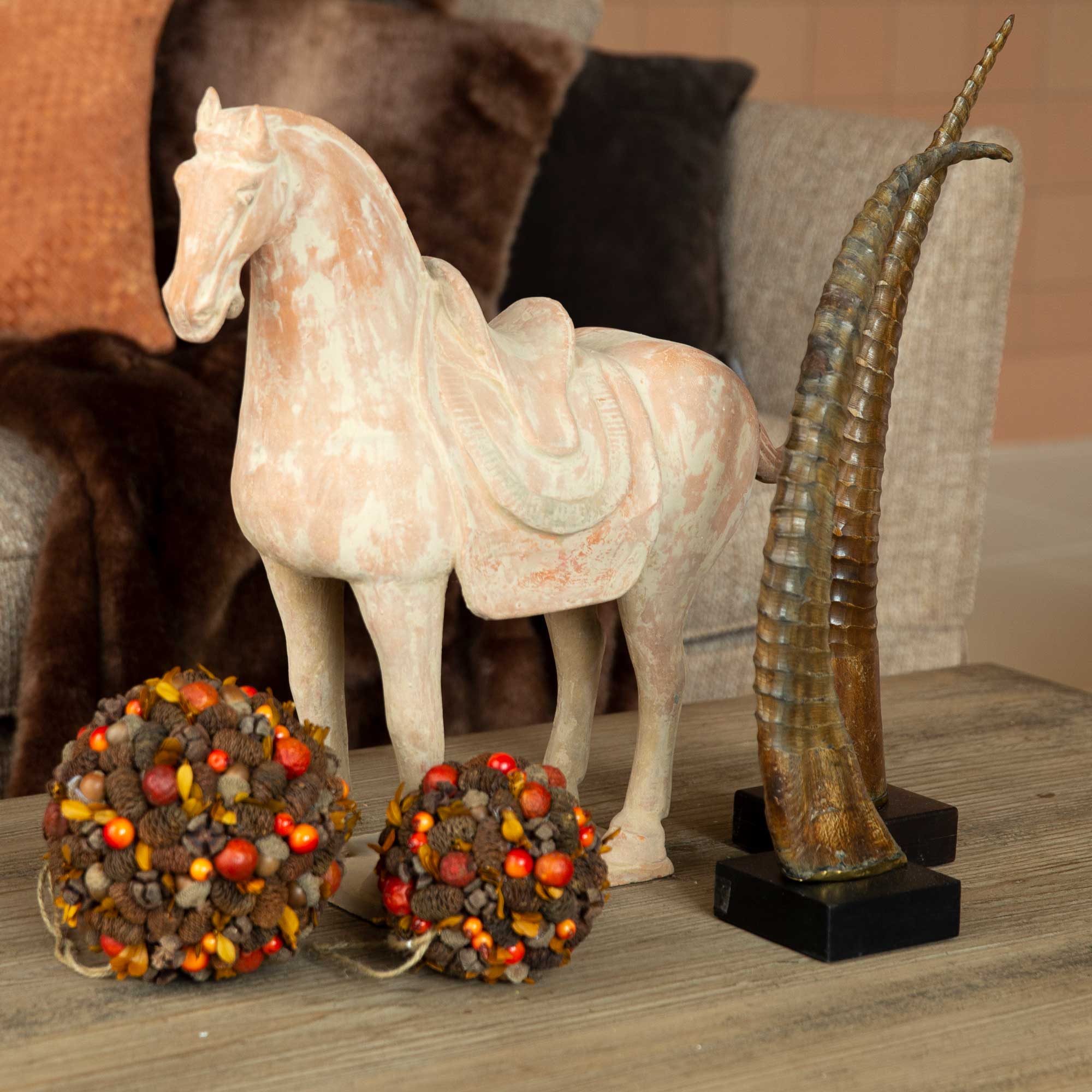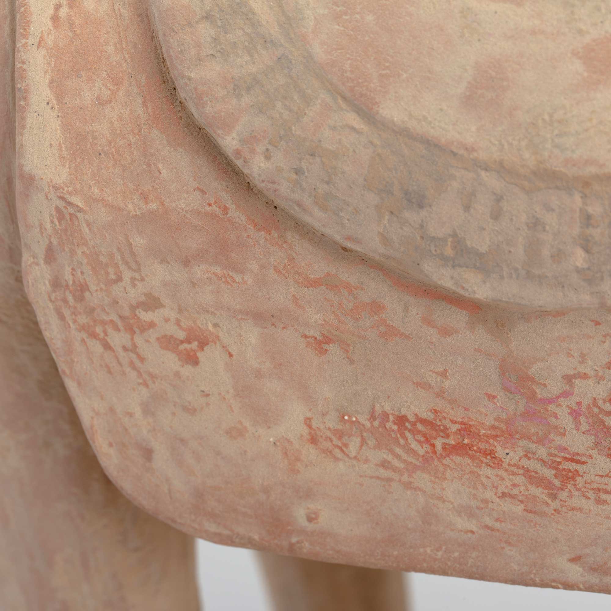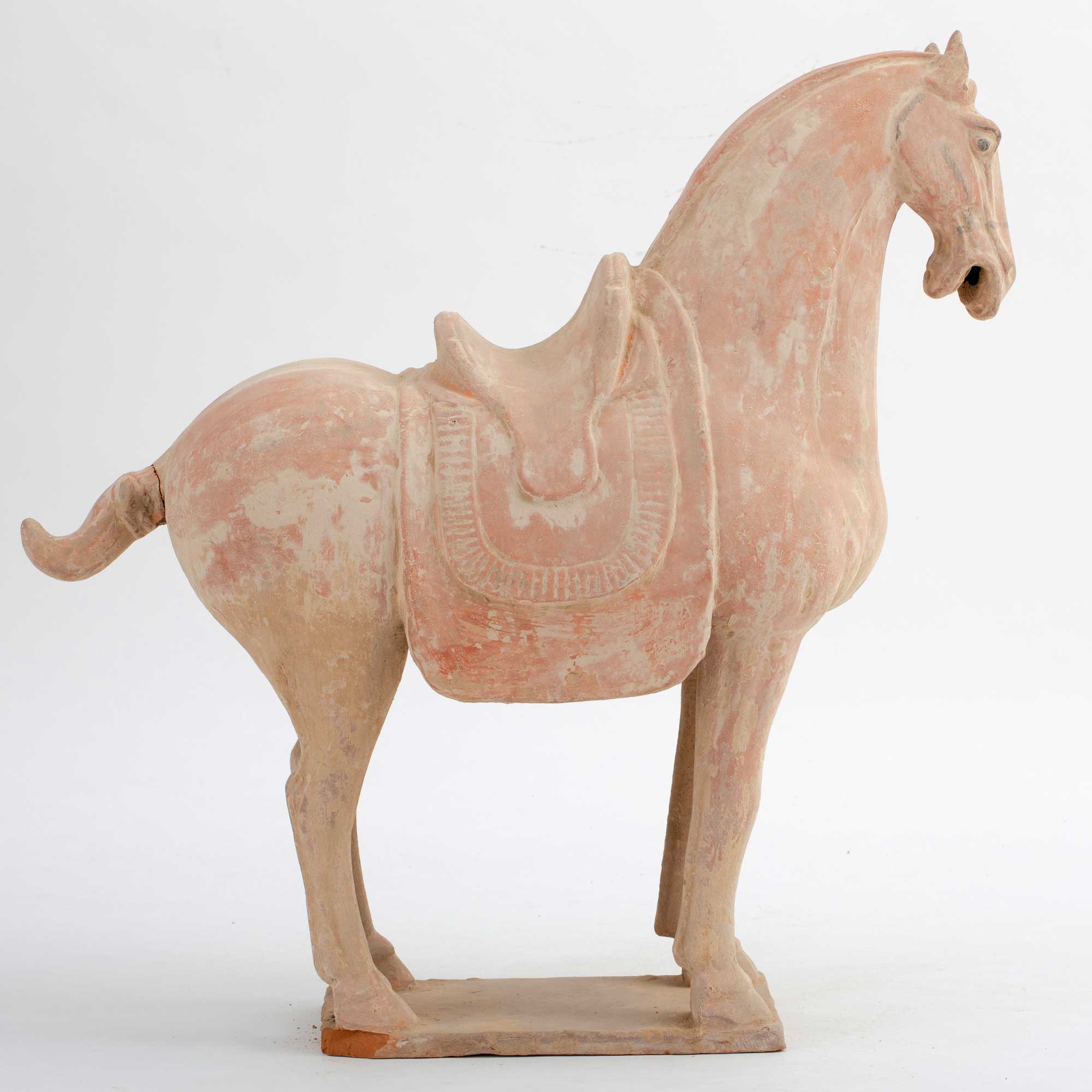 Handgearbeitetes Pferd im Stil der Tang Dynastie. Diese Skulpturen sind unter Sammlern sehr beliebt und sind wunderbar dekorativ. Höhe: 58 cm Länge: 58 cm Tiefe: 25 cm Materialien