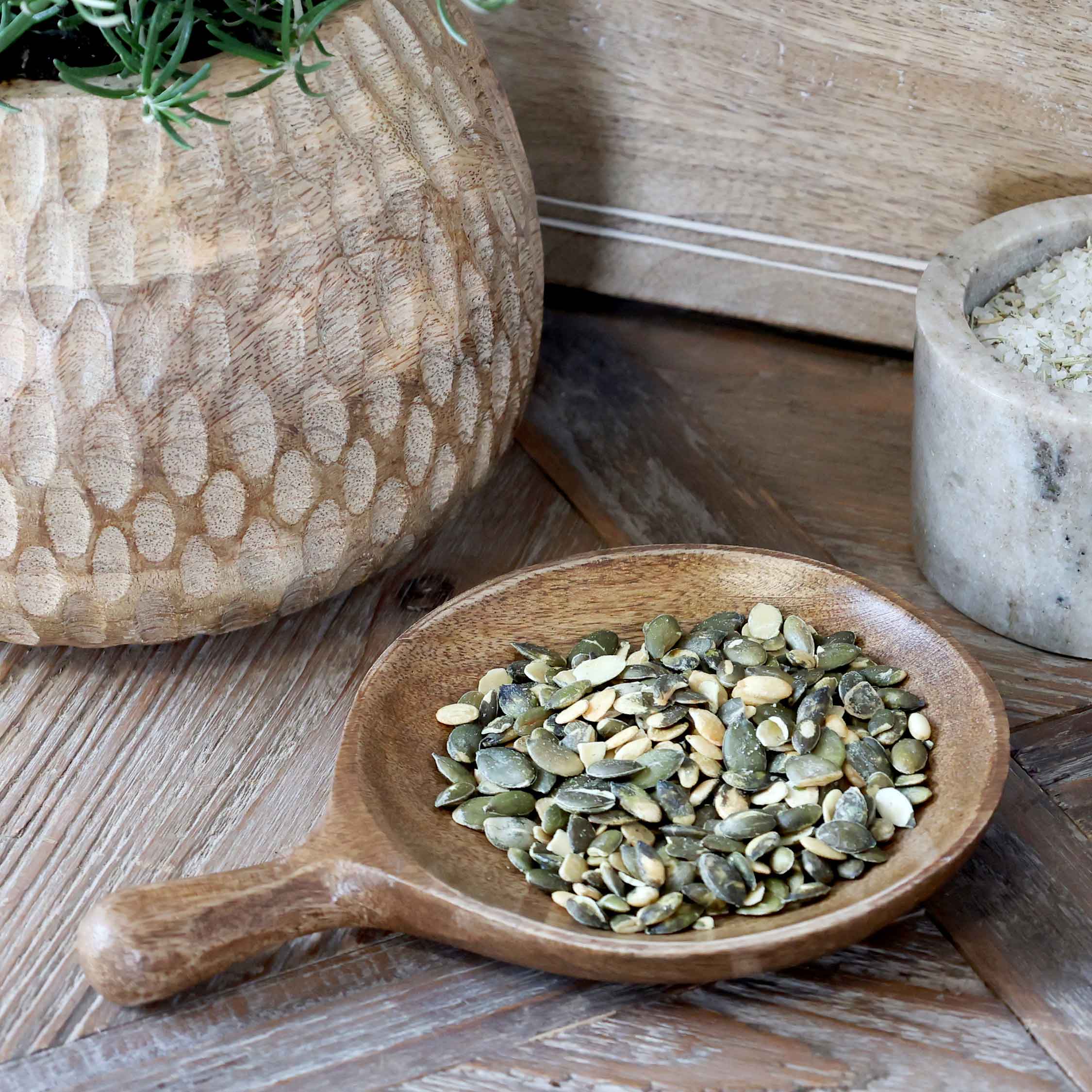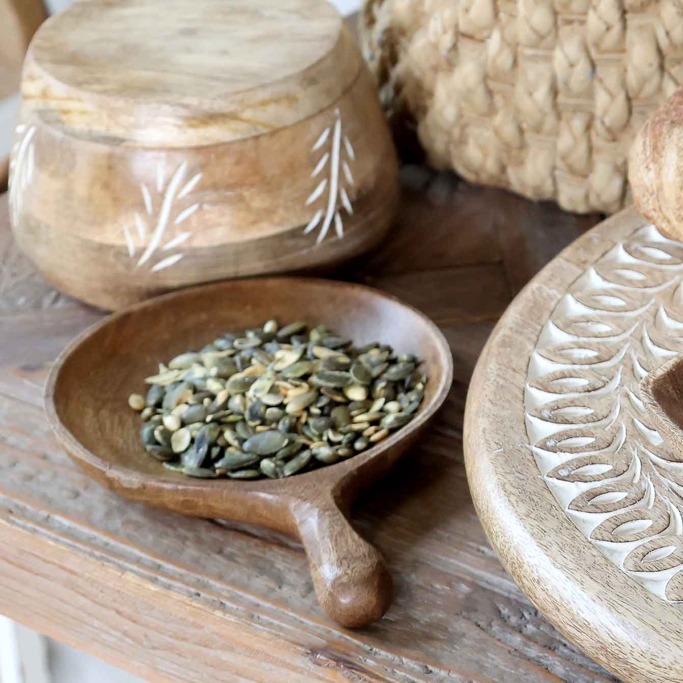 Die Toulouse -Serie ist eine Kollektion von wunderschönem Servier- und Küchengeschirr aus massivem Mangoholz, dass in weichen, organischen Formen handgefertigt wird, und einige von ihnen haben sogar atemberaubende geschnitzte Muster.